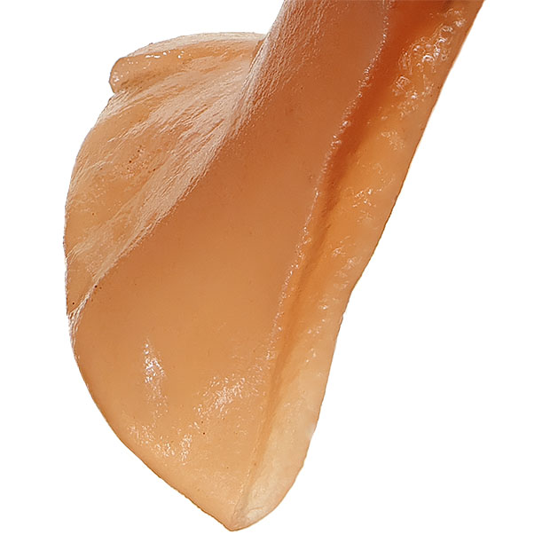 花びらがいくつも重なったような姿をしたきのこです。 肉はゼリー状で、 触ってみるとぷるぷるします。 ハナビラニカワタケのなかまは、 ウロコタケ属 Stereum の菌糸に寄生していることが知られています。