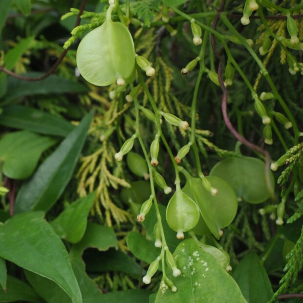 秋にハート形の黄色い葉が目立って存在感のあるつる植物です。 根は自然薯(じねんじょ)と呼ばれ、 すりおろすと粘りのある「とろろ」になります。 「むかご」と呼ばれる球芽も食べておいしいです。