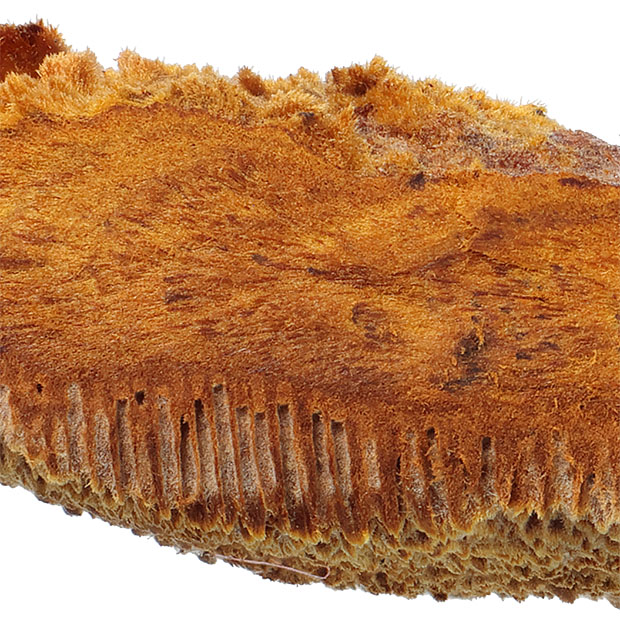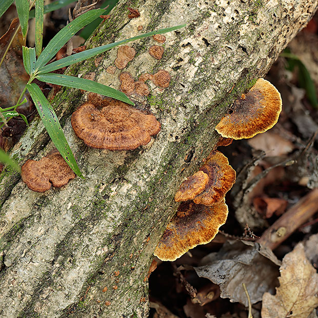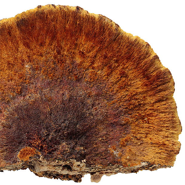 柔軟性のとぼしい乾いた粘土質をおびたかたいきのこです。 若いときの傘の周辺部は、 マスタードのような黄色をおびています。 肉は黄褐色です。