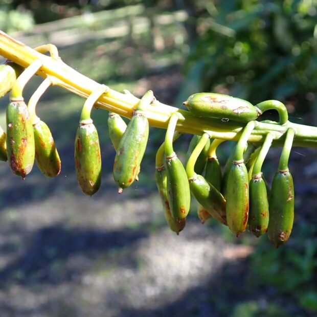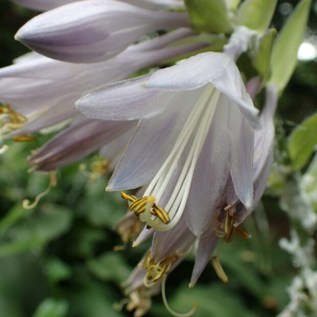 つぼみの形が橋の欄干につけられる擬宝珠(ギボシ)に似ていて葉が大きいのが名の由来です。 春先の柔らかい葉や茎が食用になり、 ウルイと呼ばれています。