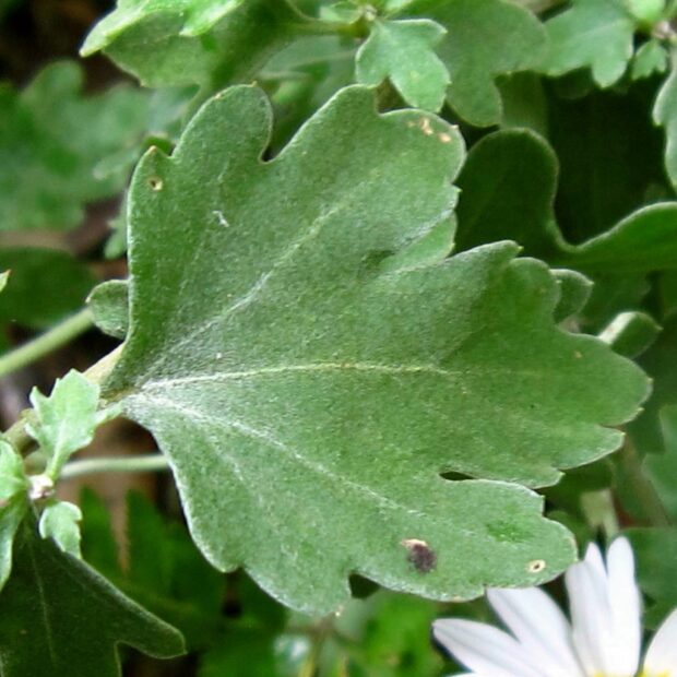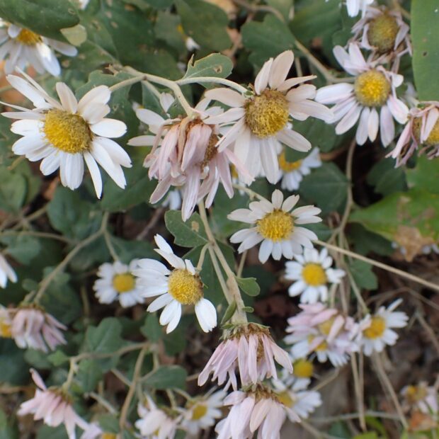 秋の野菊の一つで、 日当たりの良い斜面などで一番遅くに白い花を咲かせます。 栽培するキクに似た丸みのある葉が特徴です。