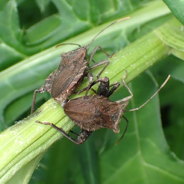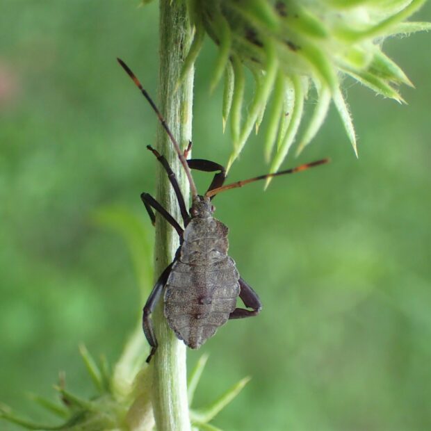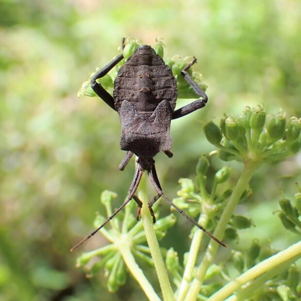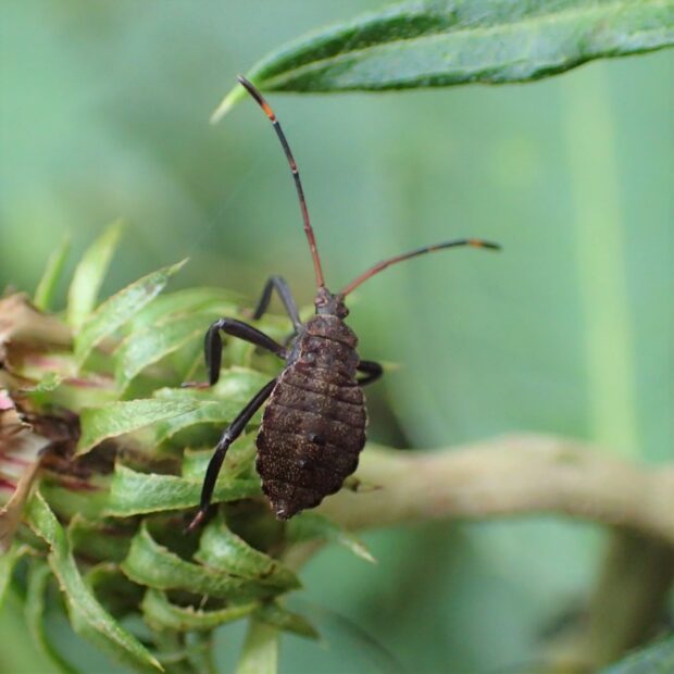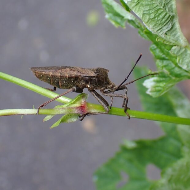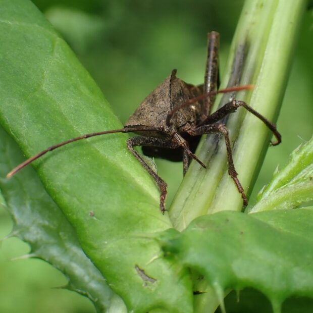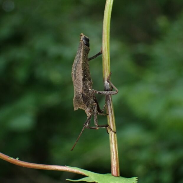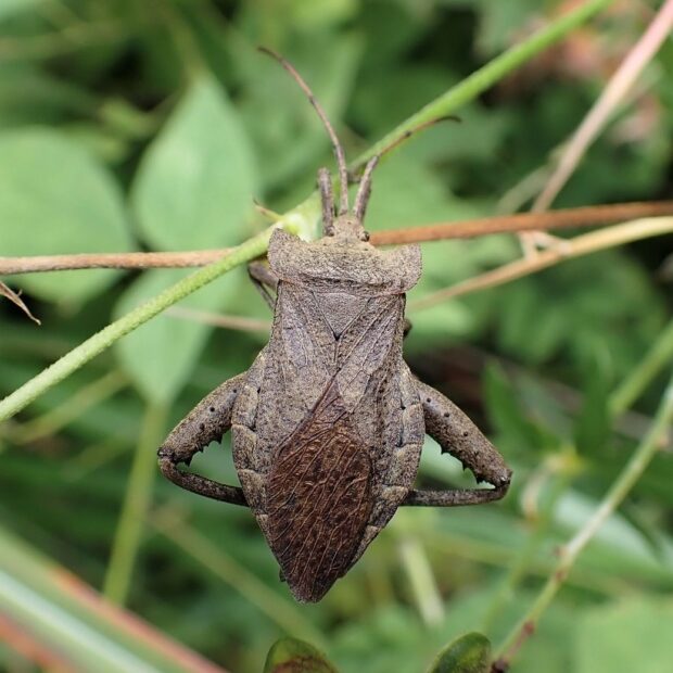 低山~山地の草はらや林縁で見られる茶色の大きなヘリカメムシ。 前胸の側角(両肩の突き出たでっぱり)が前方に張り出し、 後ろあしは太く、 王者の貫禄があります。 かなり臭いです。