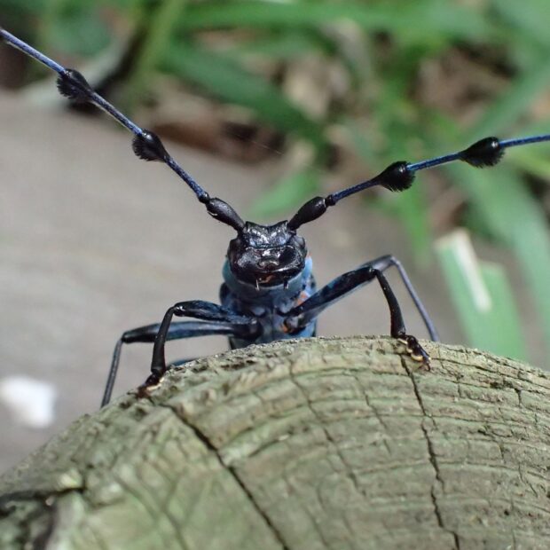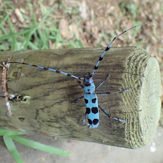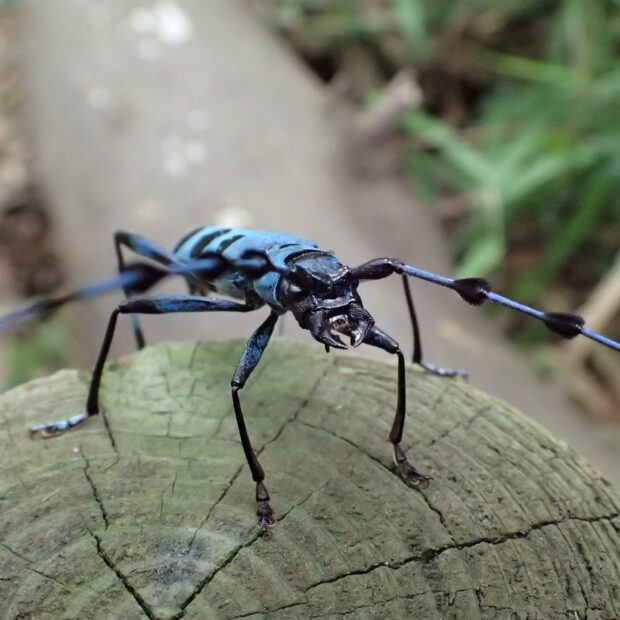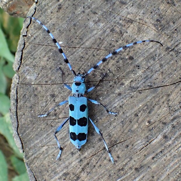 ブルーのはねに黒い紋がある美しいカミキリムシ。 倒木や伐採木に集まり、 樹液にやって来ることもあります。 山地に生息していましたが、 近年、 平地でも見られるようになりました。 日本固有種。
