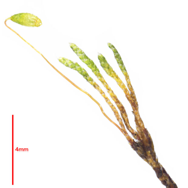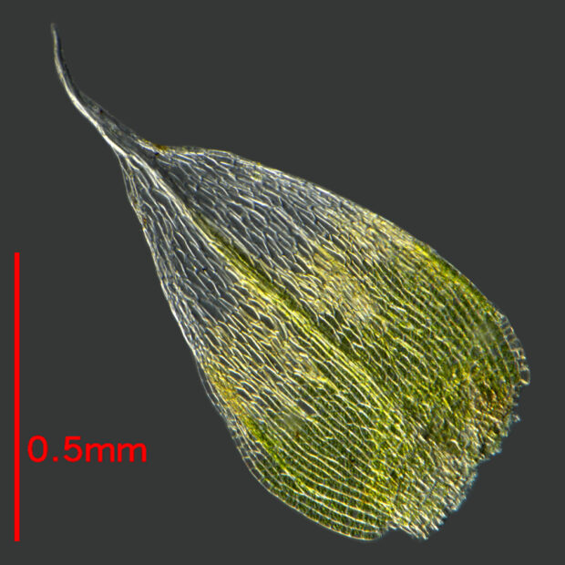 都会でもごくふつうに見られる身近なコケ。 葉の上半分に葉緑体がないため白っぽく見えます。 住宅近くの石垣、 道路のすき間などに、 白っぽいコケが生えてないか探してみよう!
