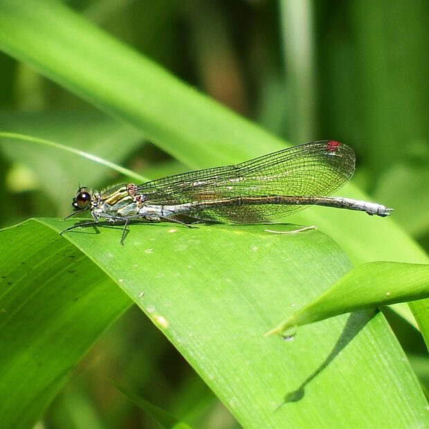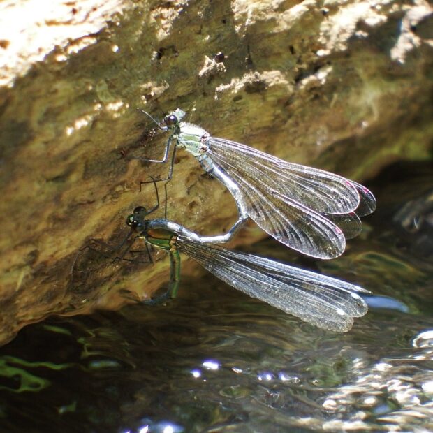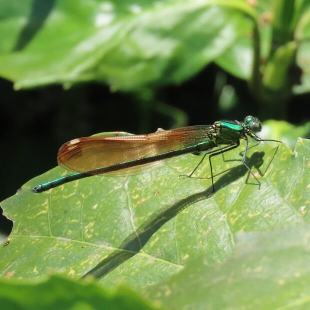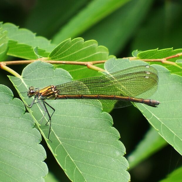 平地~山地の水生植物が茂る清流で見られるカワトンボの仲間。 はねの色は多型で、 オスは橙色、 淡い橙色、 無色の3タイプがあり、 メスは淡い橙色、 無色の2タイプがあります。 アサヒナカワトンボと非常によく似ています。 日本固有種。