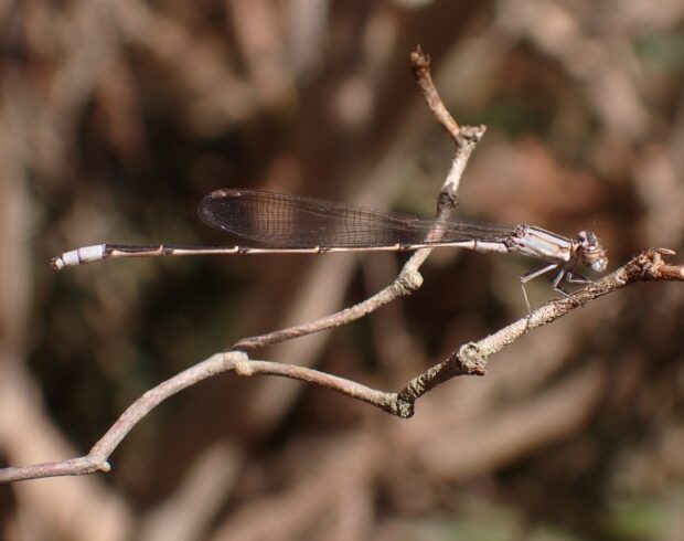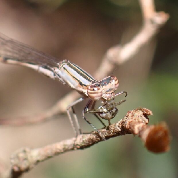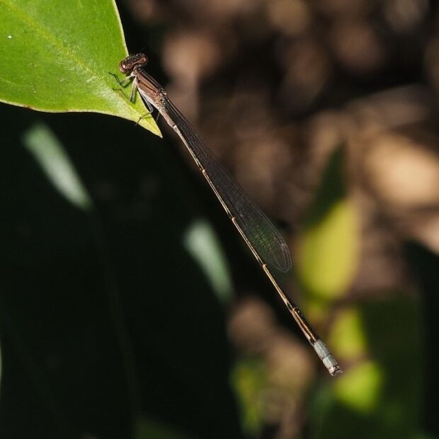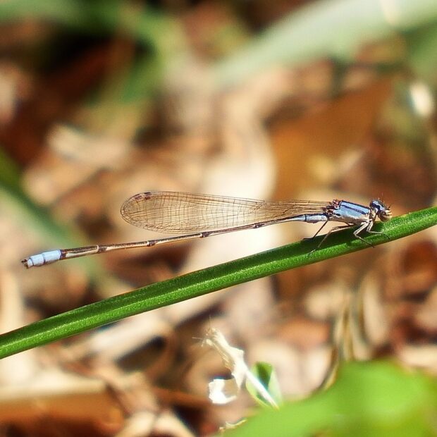 成虫で越冬するイトトンボ。 日当たりのいい池、 沼、 湿地などで見られ、 北へ分布を拡大しています。 1年に2回出現し、 夏型(夏に発生して繁殖)と越冬型(晩夏に発生し越冬し翌春に繁殖)がいます。 産卵は、 オスとメスが連結して、 水生植物の茎や水面に浮いている植物に産卵します。