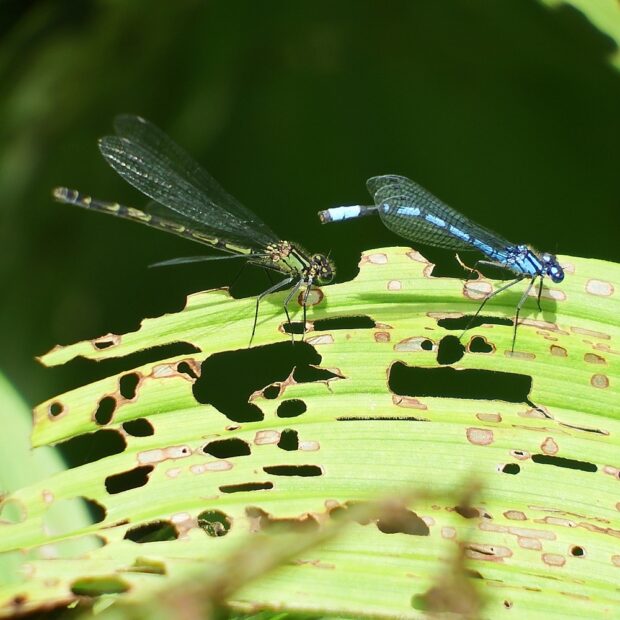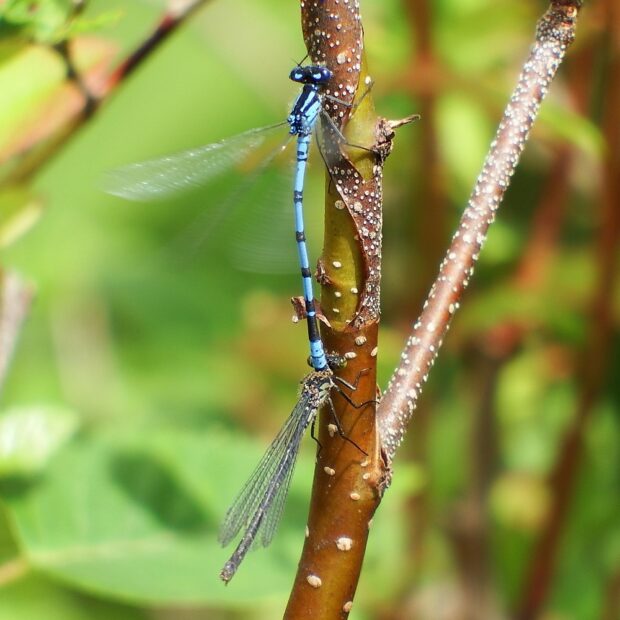 寒冷地に生息するイトトンボ。 本州では高い山の水草が多い池、 沼、 湿原で見られます。 産卵は、 オスとメスが連結またはメスが単独で、 水面近くの植物に行います。 北海道では普通に見られますが、 本州では産地が限られます。