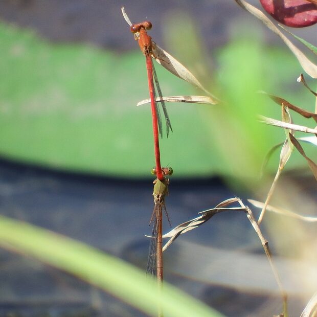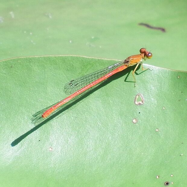 平地~丘陵地の水生植物が茂る池や沼で見られる中型のイトトンボ。 オスは全身が赤く斑紋はなく、 メスは橙褐色です。 生息地は局地的で環境省の絶滅危惧種に指定されています。