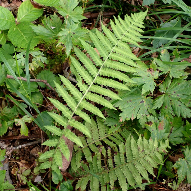 ●ミヤマシケシダ・・・ウスゲミヤマシケシダよりも小型で、 葉柄は細めで基部が粘液に覆われません。 深山の林内に多いです。