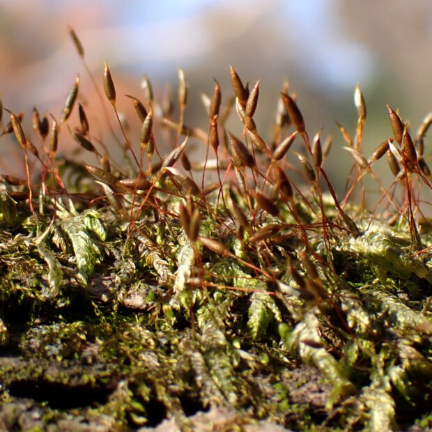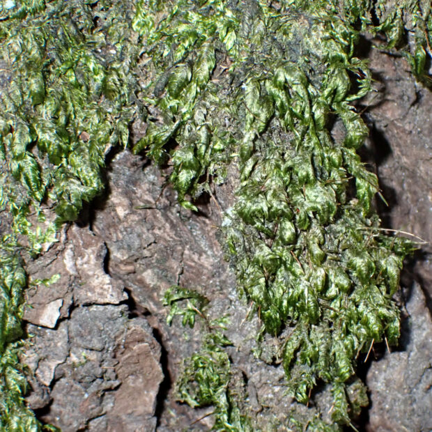 木の幹によくマット状に生えている身近なコケの1つ。 その名の通りツヤのある葉が特徴で、 光を照らすと反射してギンギラギンに輝きます。