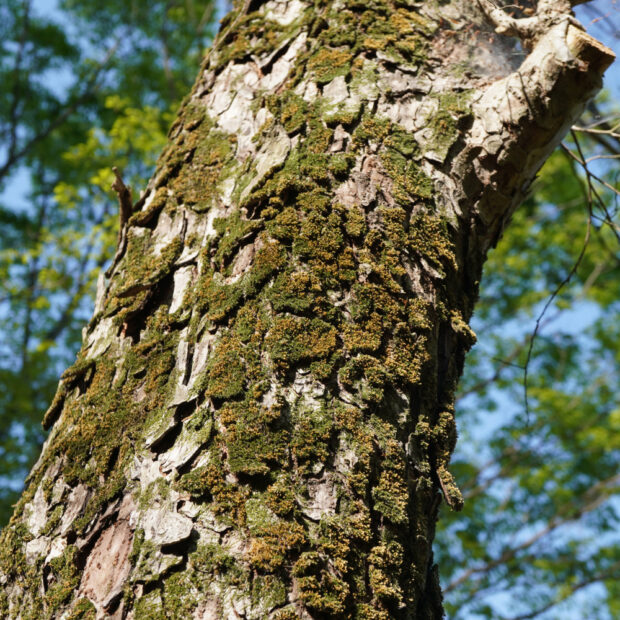 身近にありふれたコケの1つ。 しばしば街路樹のケヤキやサクラの幹を覆って白っぽい蒴(さく)をたくさんつけます。 蒴の帽が外れると中央が赤っぽく見え、 その姿から「クチベニゴケ」の別名もあります。