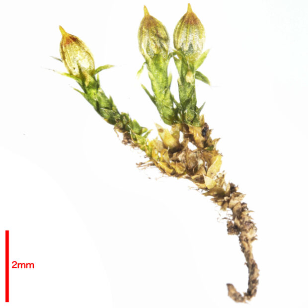 ・サヤゴケは蒴柄が長く、 サヤ状の雌苞葉(しほうよう)がそれを包む。 葉先は透明にならない。