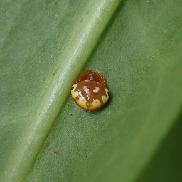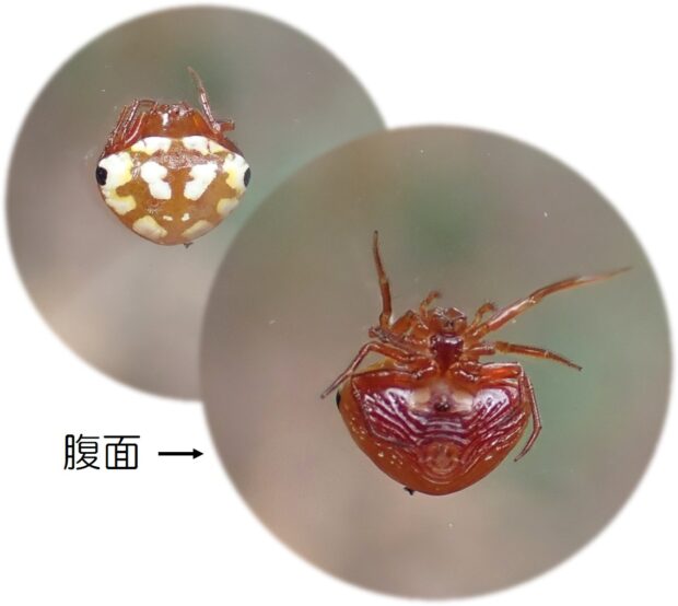 里山~山地に生息し、 昼間は草や木の葉裏でじっとしています。 夕方から活動を始め、 小さな同心円状のまるい網を張ります。 色の変異があり、 黒っぽいものや、 黒地に赤色が入るものがいます。