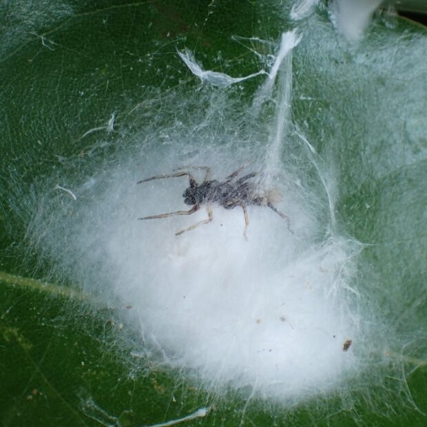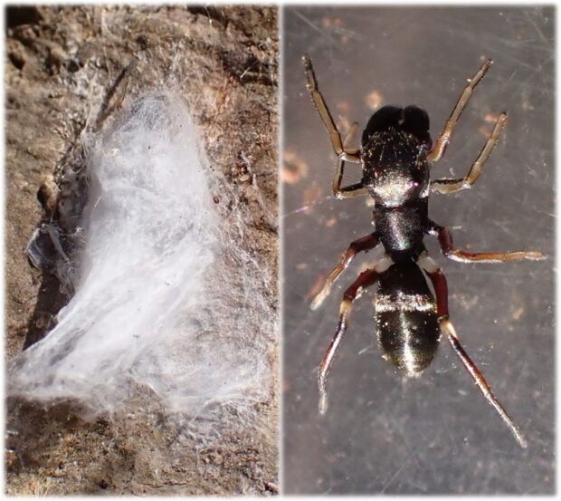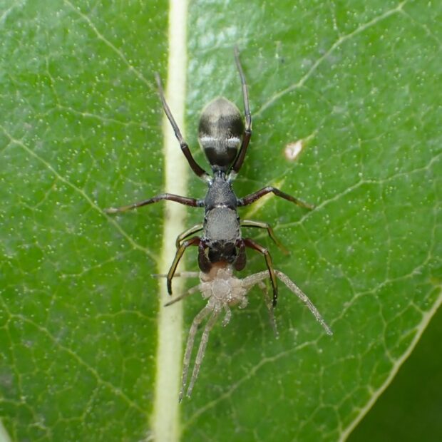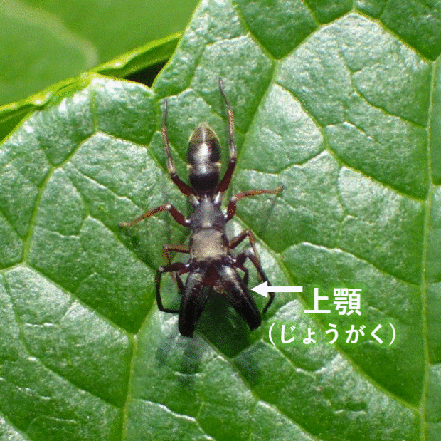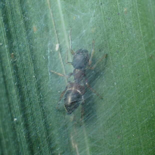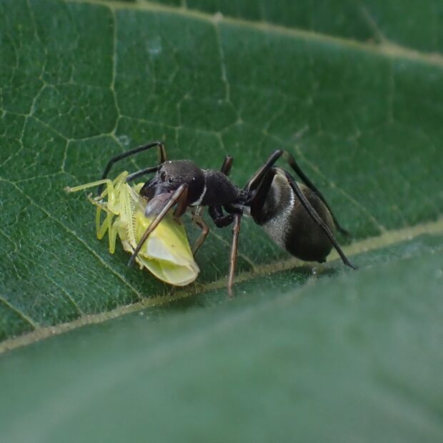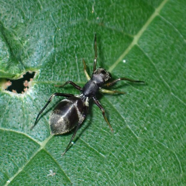 アリによく似ているハエトリグモ。 アリを嫌う動物が多いことから、 アリに化けて身を守っています。 都市部の公園~山地で普通に見られ、 木や草の葉を歩き回って獲物を探します。 アリとは動きが違いますので注目して見てみましょう。