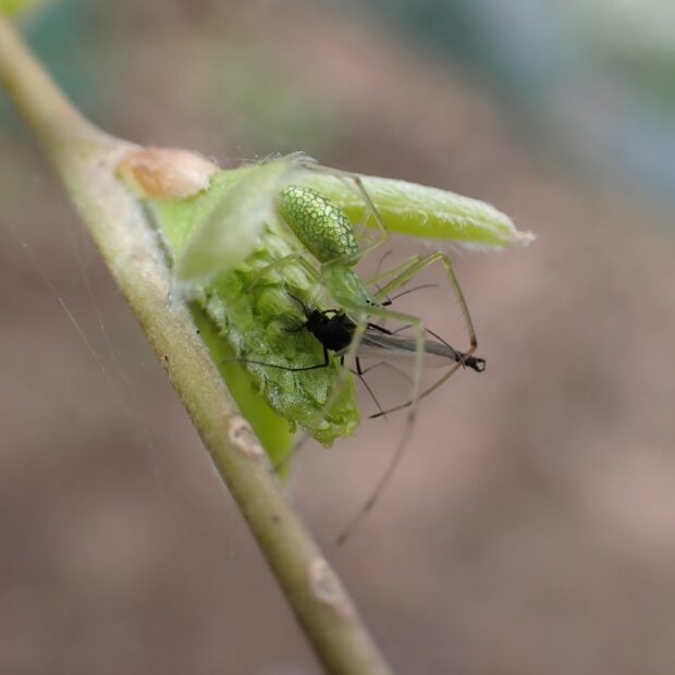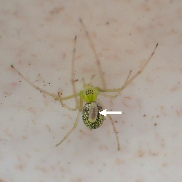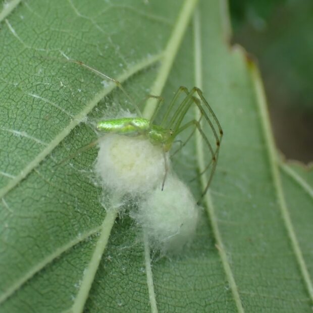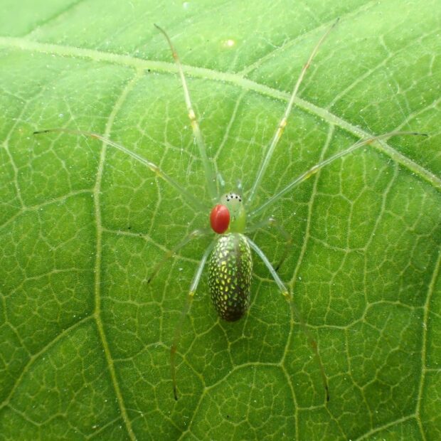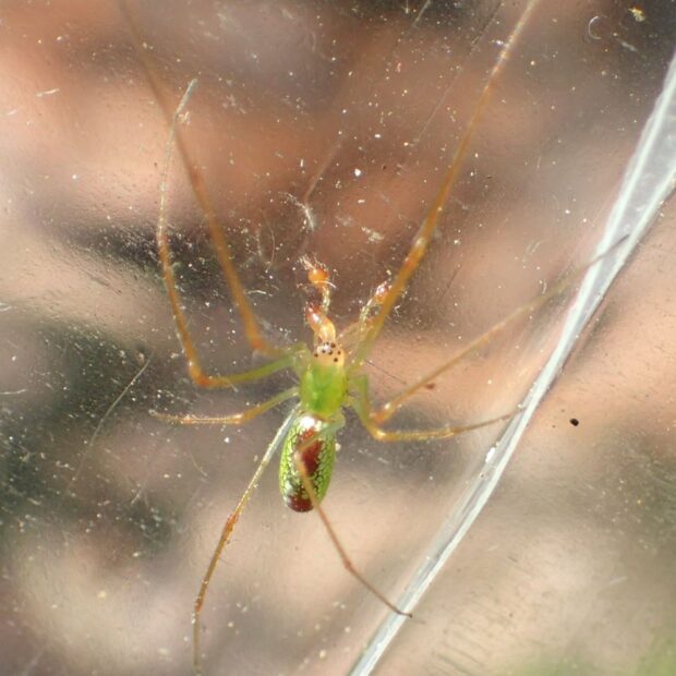 都市部~山地まで広く生息し、 普通に見られるアシナガグモ科の仲間。 小さな水平円網を作りますが、 網をはらず虫をとらえることもあります。 メスはエゾアシナガグモとの区別が難しいです。