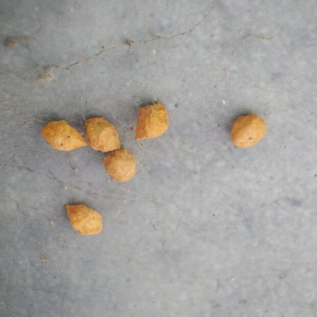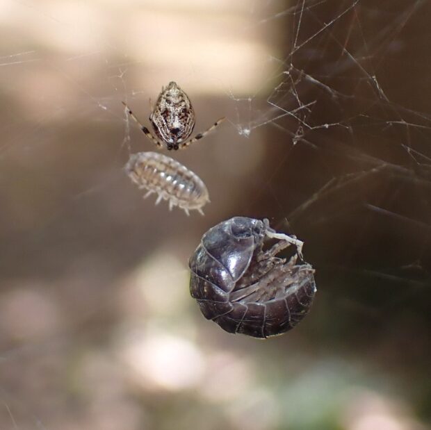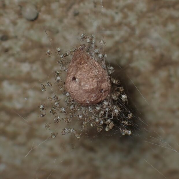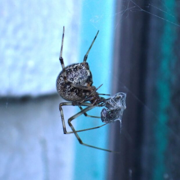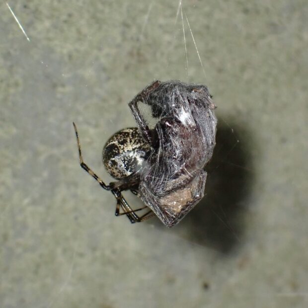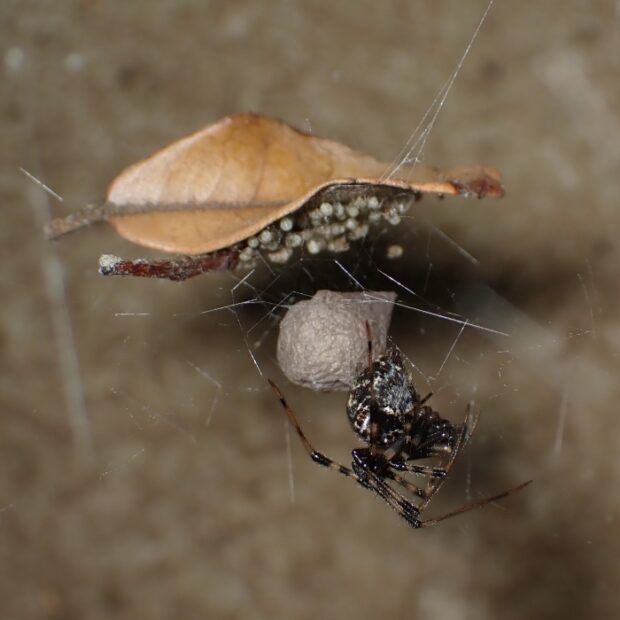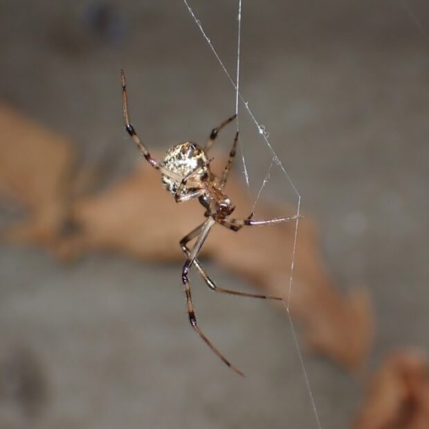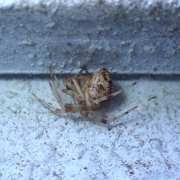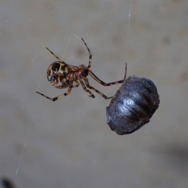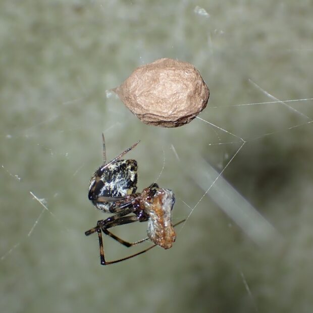 世界中に広く分布し、 最も普通に見られるヒメグモ科の仲間。 建物の内外や人工物に多いですが、 樹木でも見られます。 不規則な網をはり、 粘球のついた糸を地表におろして、 地面や壁を歩く虫などをとらえます。 獲物は粘球に触れると、 宙づりになります。