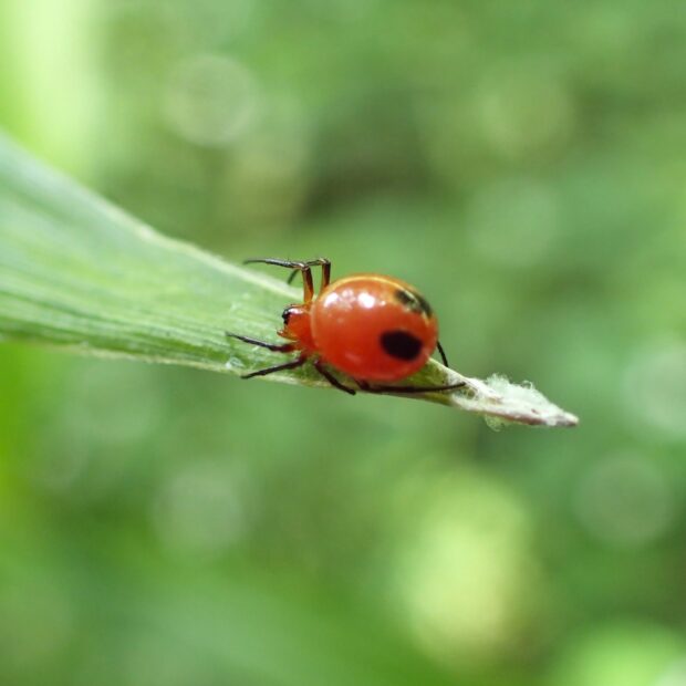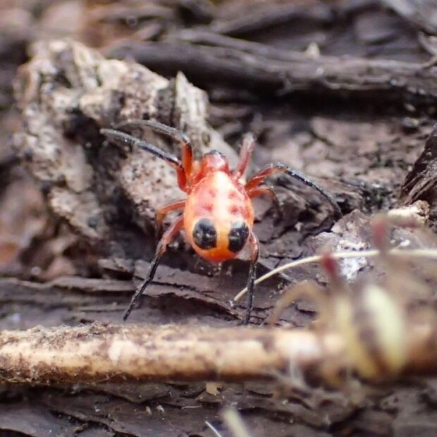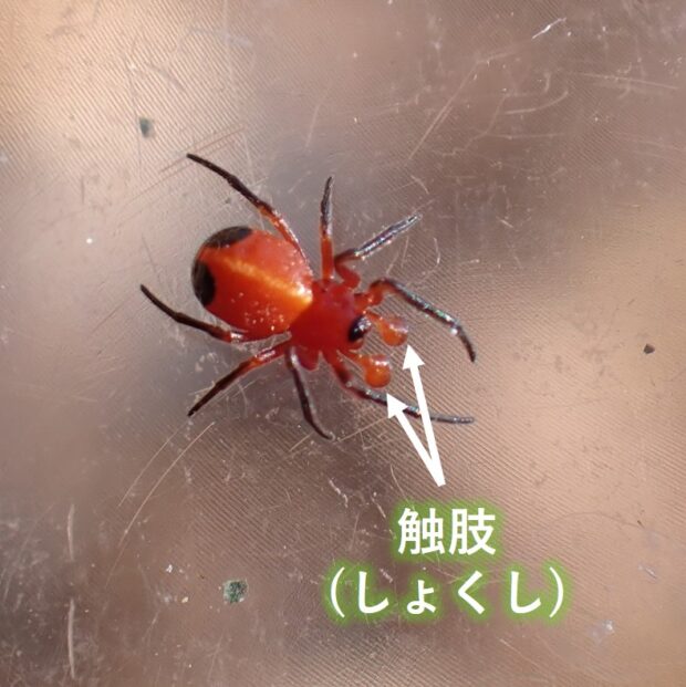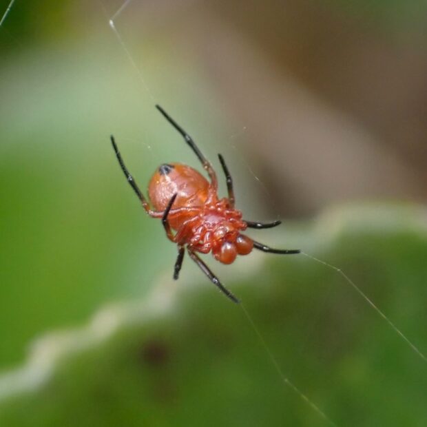平地~山地で普通に見られるコガネグモの仲間。 猩々(しょうじょう=架空の動物)のように体が赤いことが名前の由来ですが、 腹部の斑紋や色には変異が多く、 黒いもの、 赤いもの、 黒色に白や黄色の線があるものなど、 様々なタイプが見られます。