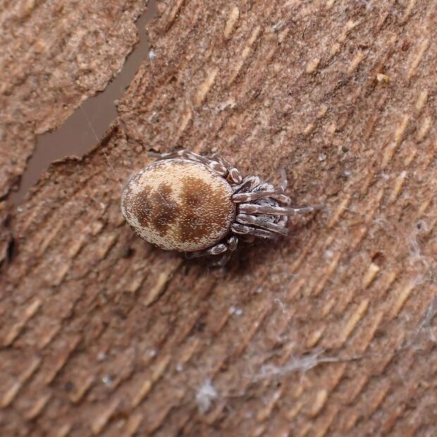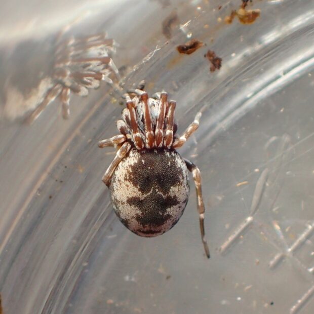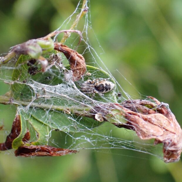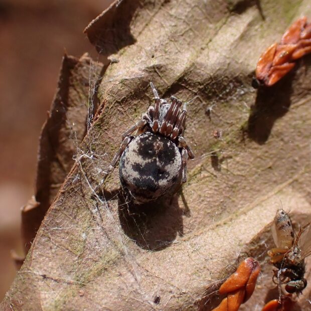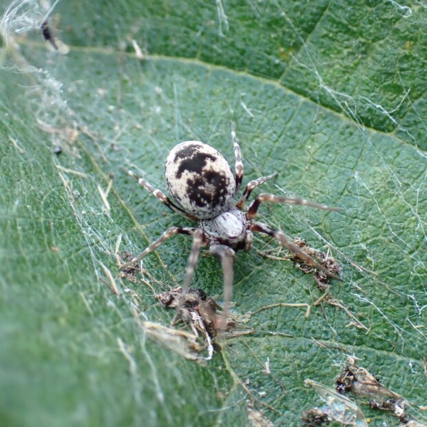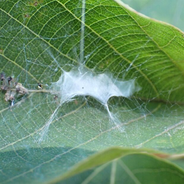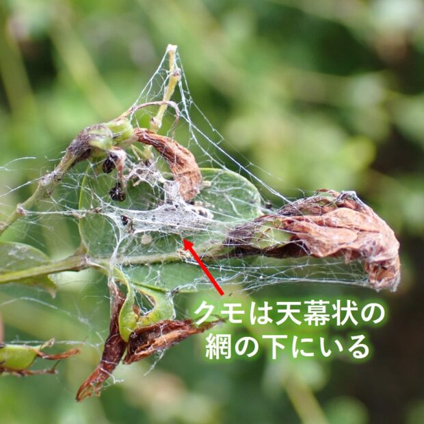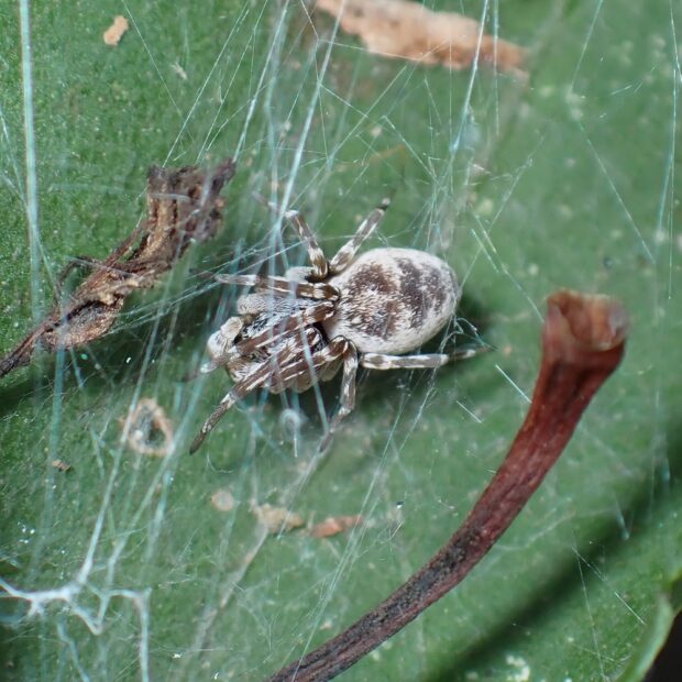 人家周辺の、 木の葉上やフェンスなどで普通に見られるハグモの仲間。 クモは葉の上につくられた天幕と呼ばれる白い幕の下に隠れています。 網の糸は粘らず、 束になった非常に細かい糸(梳糸=そし)で、 獲物の虫をからめとります。