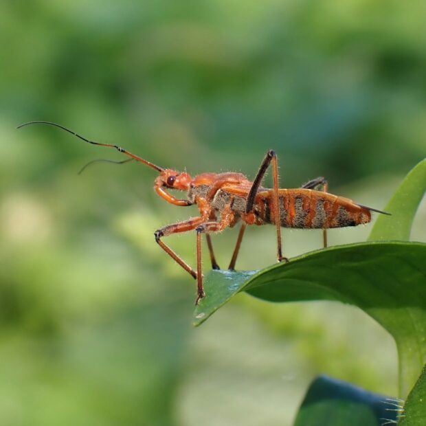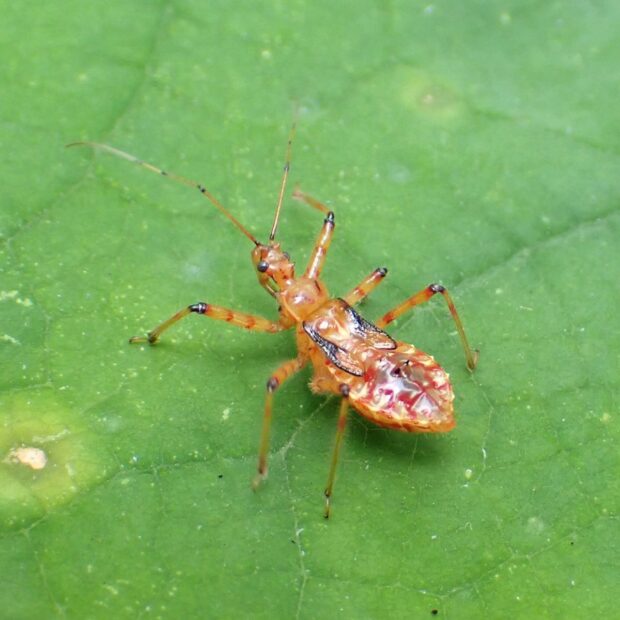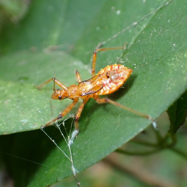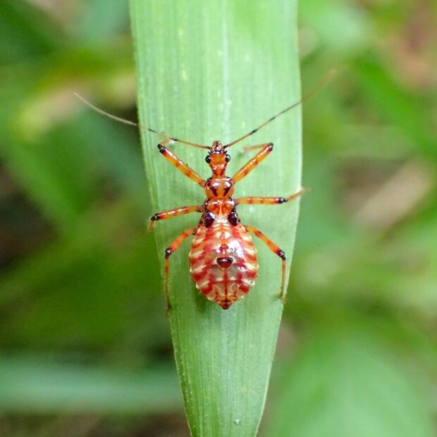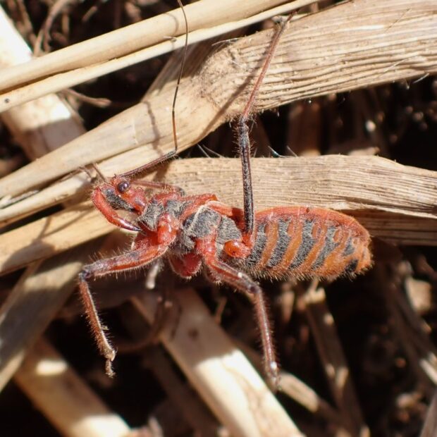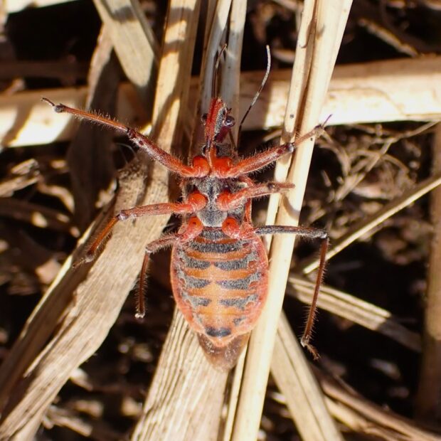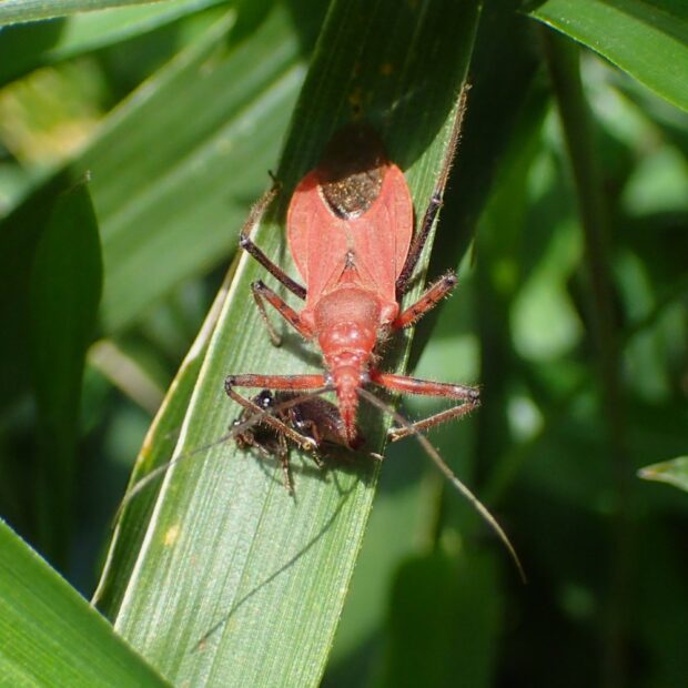 サシガメは肉食のカメムシの仲間。 全体が赤っぽいサシガメですが、 黒っぽくなるのもいます。 平地~山の草はらなどで普通に見られ、 昆虫などを捕えて体液を吸います。