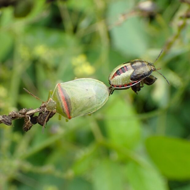 体は透明感のある淡い緑色で、 胸に一文字の帯があるカメムシ。 帯が紅色なのがオスで、 白色なのがメスです。 マメ科植物に多く、 畑のダイズ、 アズキ、 インゲンなどのマメ類にもやって来ます。 (MT)