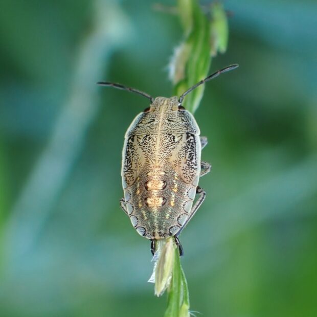 体の両側に白いヘリがあるイネ科植物で見られるカメムシ。 成虫は7月頃田んぼに現れ、 イネの穂を吸い、 斑点米になることがあります。