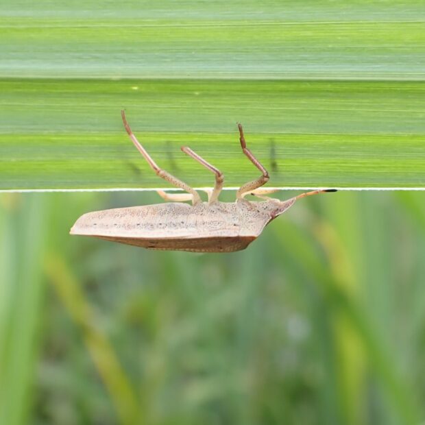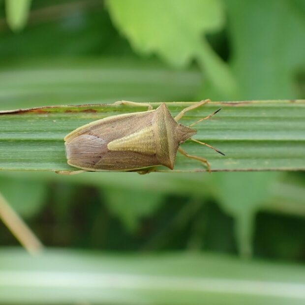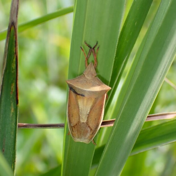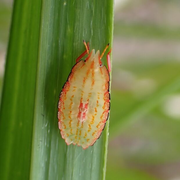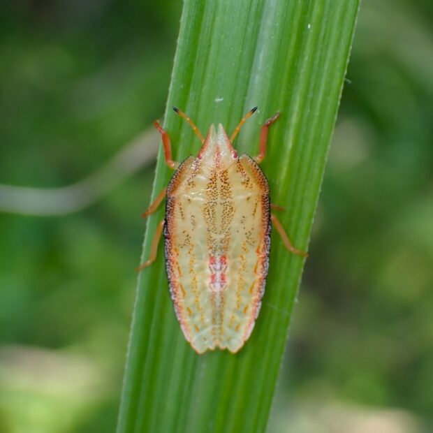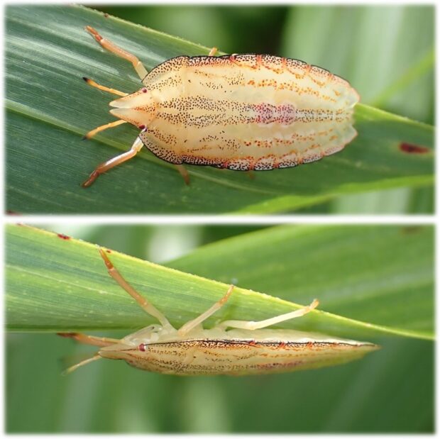 平地~山で見られるイネ科植物につくカメムシ。 ススキなどイネ科植物で普通に見られます。 幼虫と成虫では姿が違っており、 幼虫はカラフル。 夏に成虫になりそのまま越冬します。