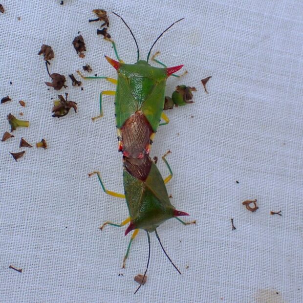 胸の両側の赤いツノが極めて鋭いツノカメムシ。 幼虫は主にケンポナシで育つことが知られています。 オスは、 腹部の末端に赤いハサミ状の突起がありますが、 メスにはありません。