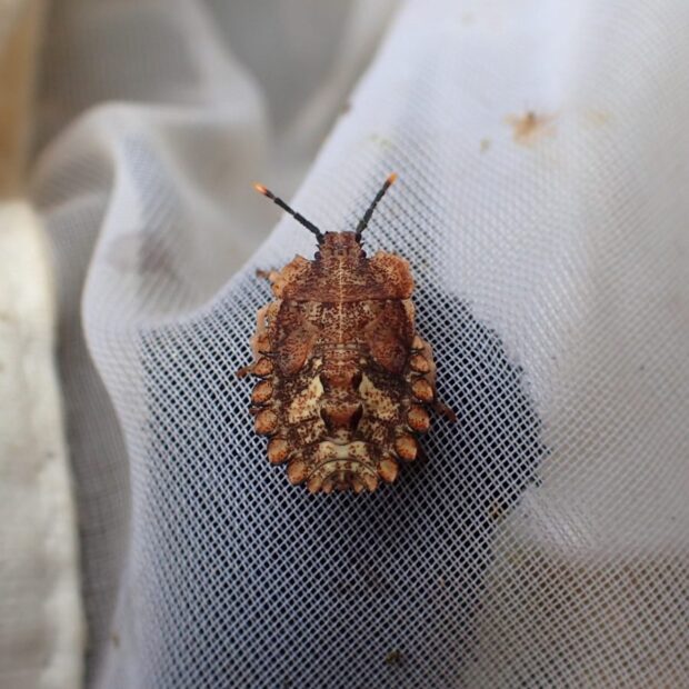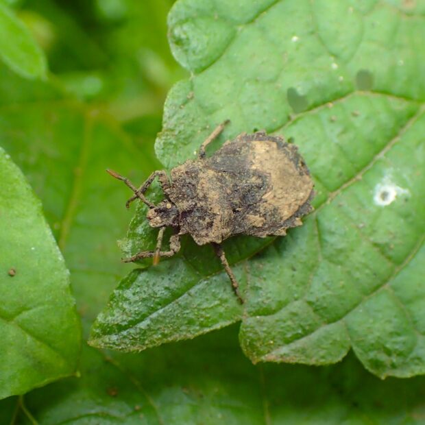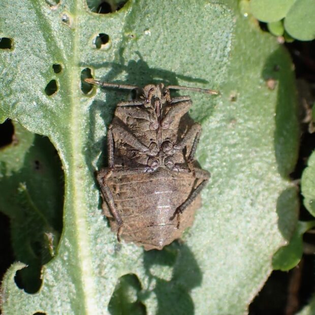 茶褐色で、 腹部の周りはノコギリのようにギザギザしたカメムシ。 ウリ科植物につき、 畑のカボチャやキュウリなどにもやって来ます。 鎧を着たような姿と先端がオレンジ色の触角が特徴です。