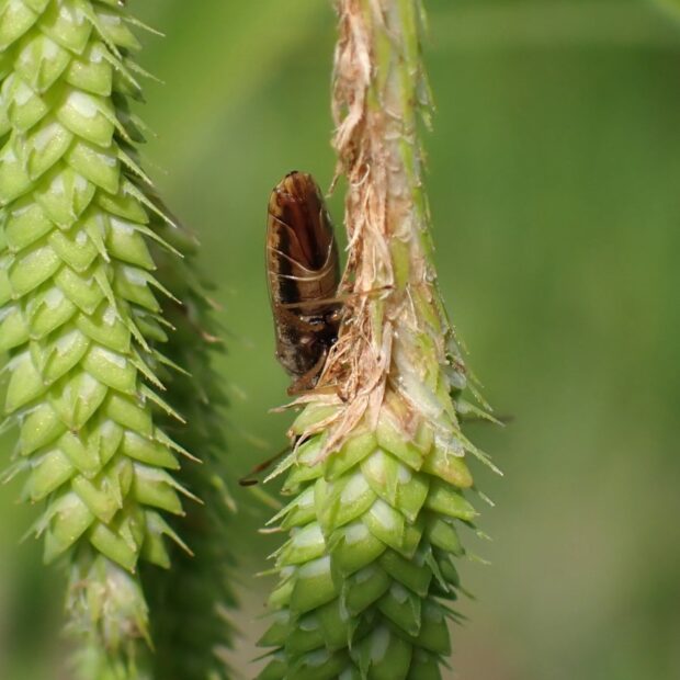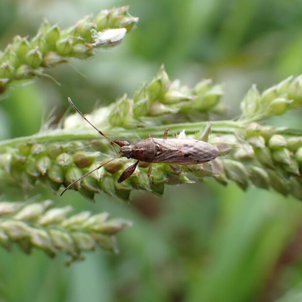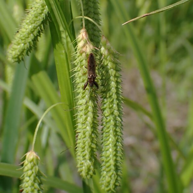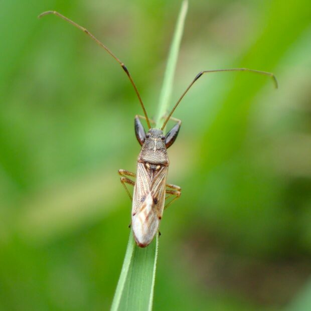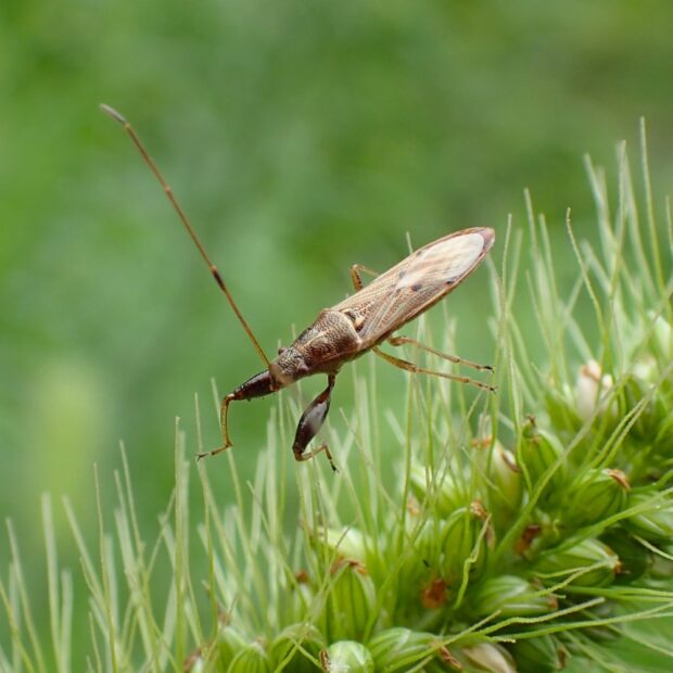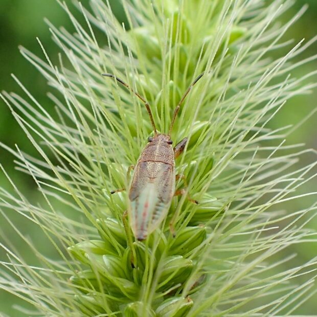 イネ科の雑草が生える草はらで普通に見られるナガカメムシの仲間。 エノコログサなどのイネ科植物の穂先で群れていることが多いです。 ほっそりしており、 長い触角と太い前あしが特徴です。