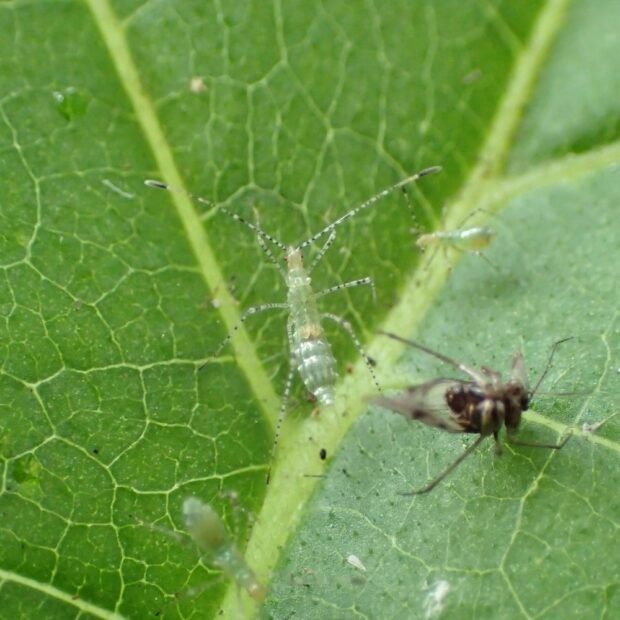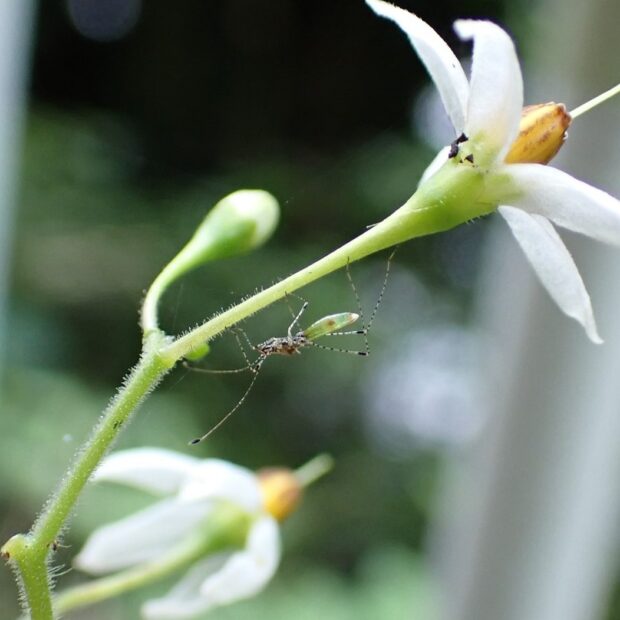 とても小さなイトカメムシの仲間。 キリ、 ゴマ、 ヒヨドリジョウゴなどで見られます。 触角とあしが長く、 ほっそりと繊細な姿をしています。 イトカメムシに似ていますが、 本種はより小型で、 触角とあしの紋が明瞭です。