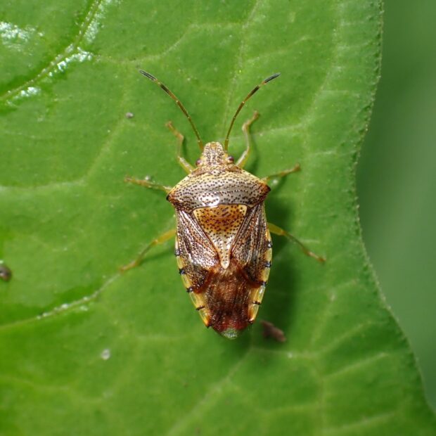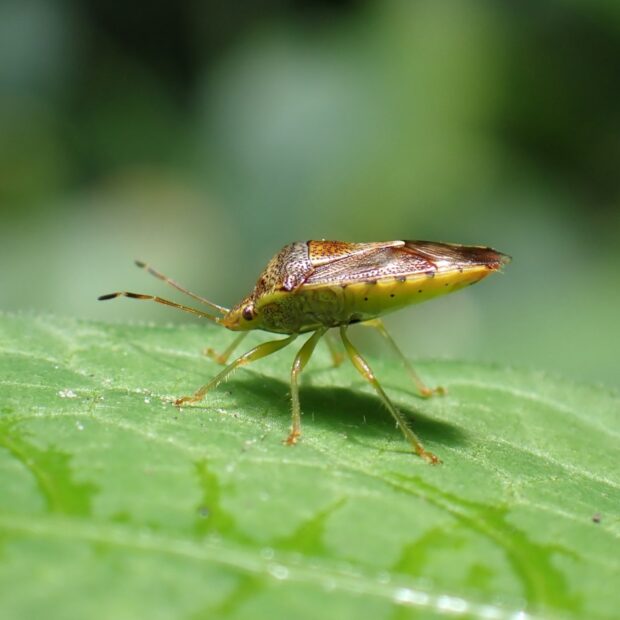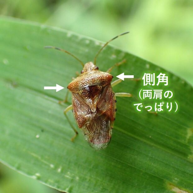 小型のツノカメムシの仲間。 色彩は、 赤みが強いものから緑色が強いものまで変異があります。 メスは卵を保護し、 幼虫がふ化した後もしばらく体の下で守ります。