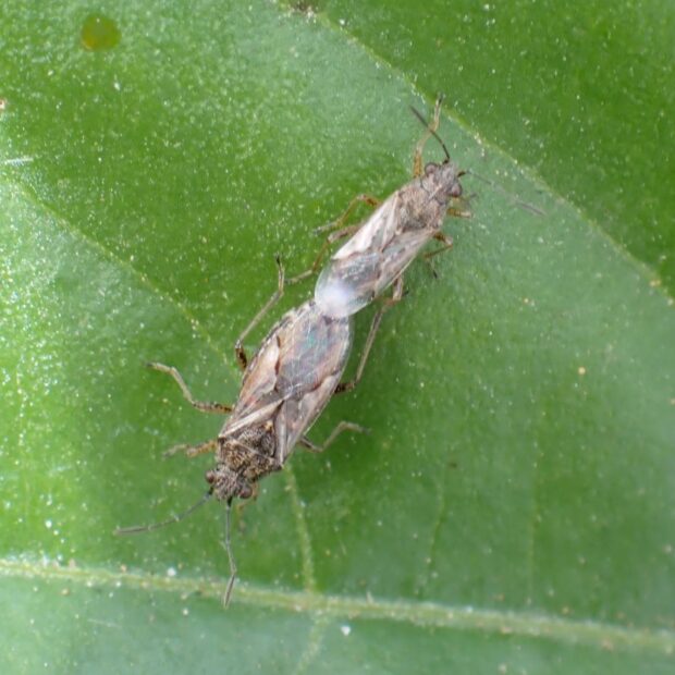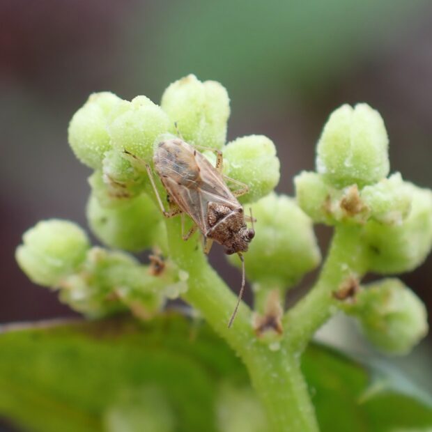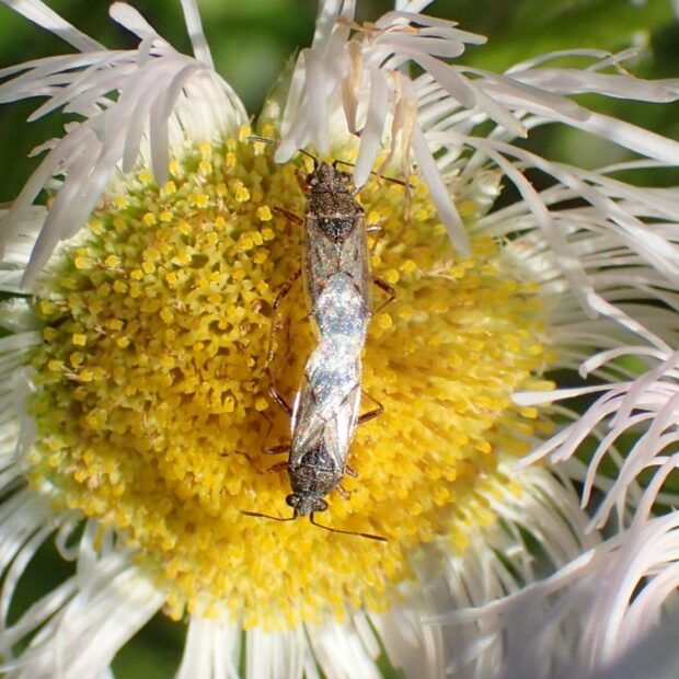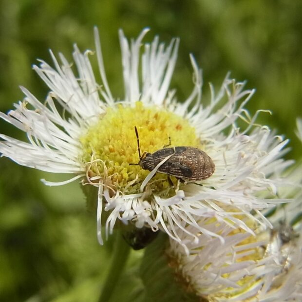 マダラナガカメムシの仲間。 キク科の花などに群れでいることが多く、 小さく地味な色合いで目立ちません。 この仲間は近似種が多く、 識別には注意が必要です。