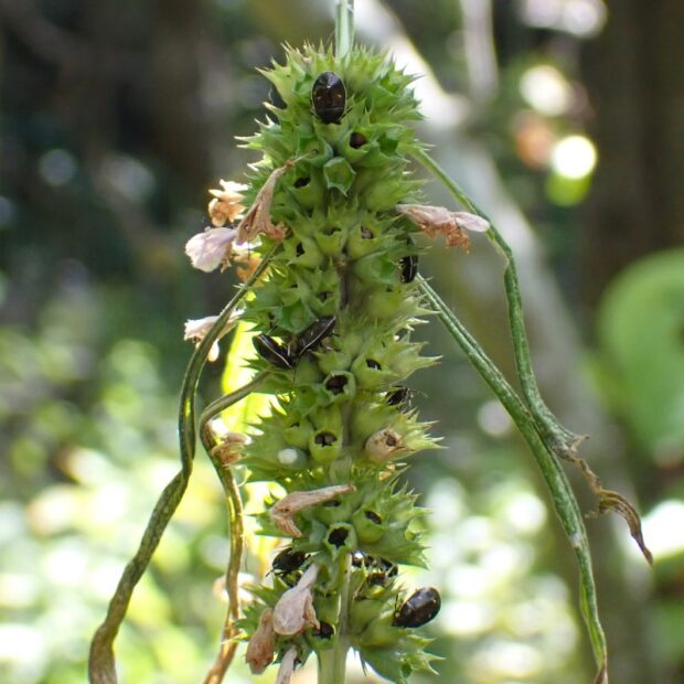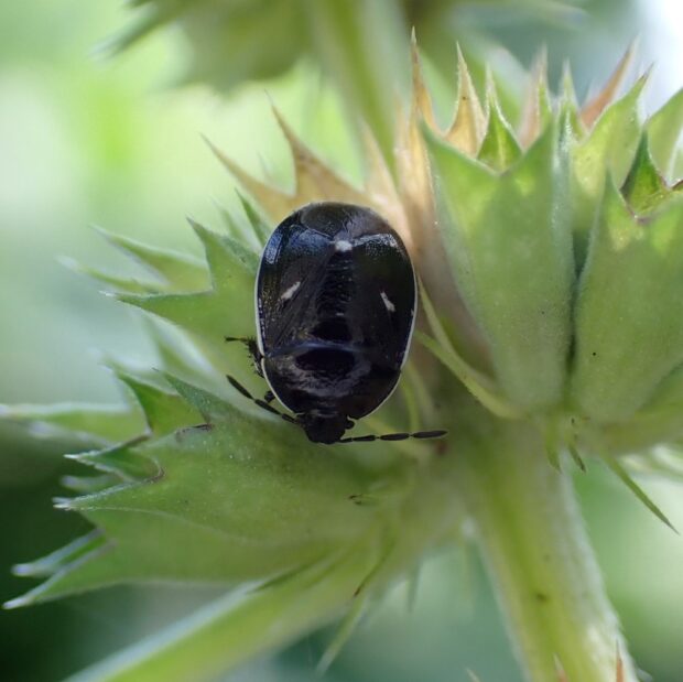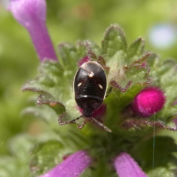 黒い体に白いふちどり、 背中に3つの白い紋があるカメムシ。 シソ科の草に集まります。 お母さんカメムシは産卵後、 卵を守り、 幼虫がふ化した後も、 幼虫にエサのタネを運びます。