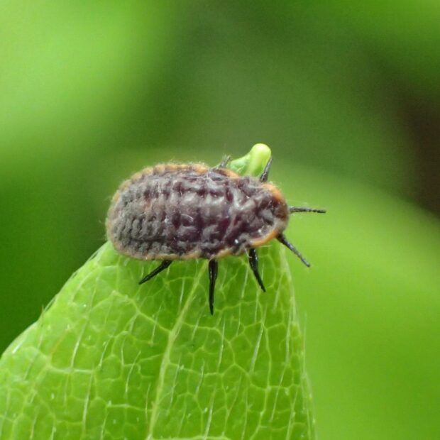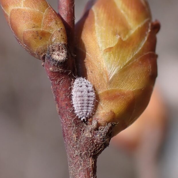 ワタフキカイガラムシの仲間。 メスはワラジ型、 体は褐色で白い粉(ロウ物質)で覆われます。 オスは、 赤い体に黒いはねをもちます。 あしをもち、 幼虫から成虫まで歩くことができます。