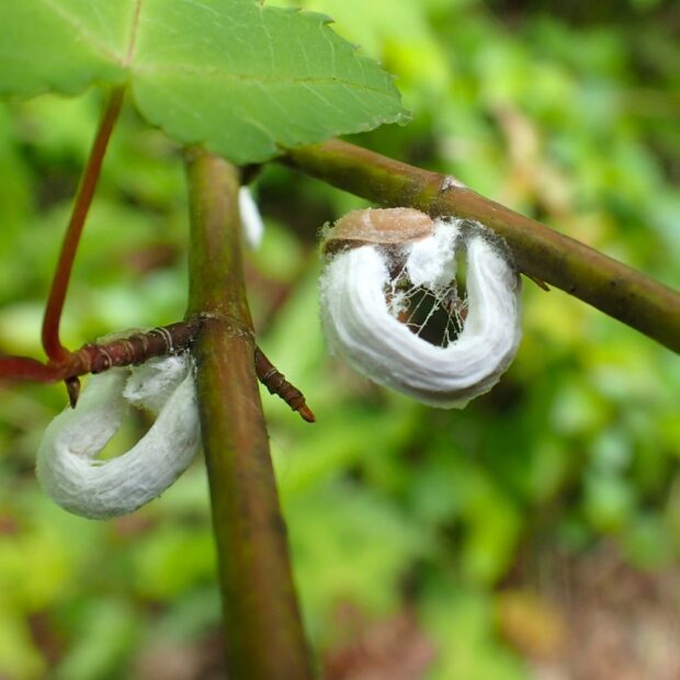 カタカイガラムシの仲間。 メスの成虫は、 茶色い部分が虫の本体で、 白いひものようなものは多数の卵を包んだ卵のうです。 オスは小さくはねがあります。 年一化性で、 5月頃見られます。 (MT)