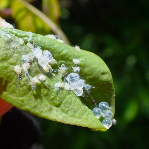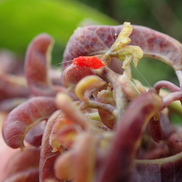 アケビにつく赤い小さなキジラミ。 キジラミとは植物の汁を吸う小さなカメムシの仲間。 幼虫は葉を二つ折りにした中で葉の汁を吸っており、 幼虫がいると葉は縮れて色が変わります。 (MT)