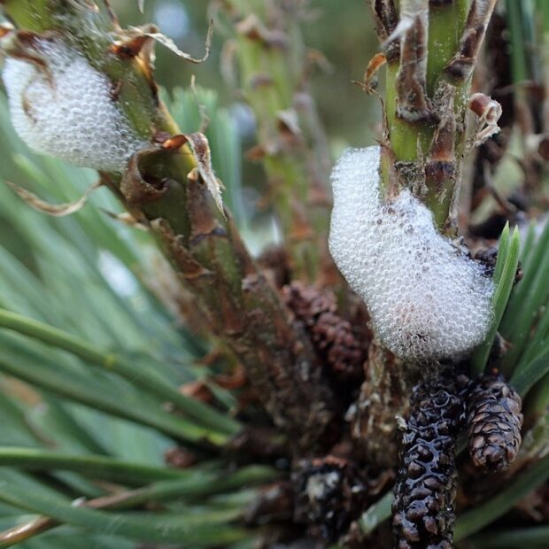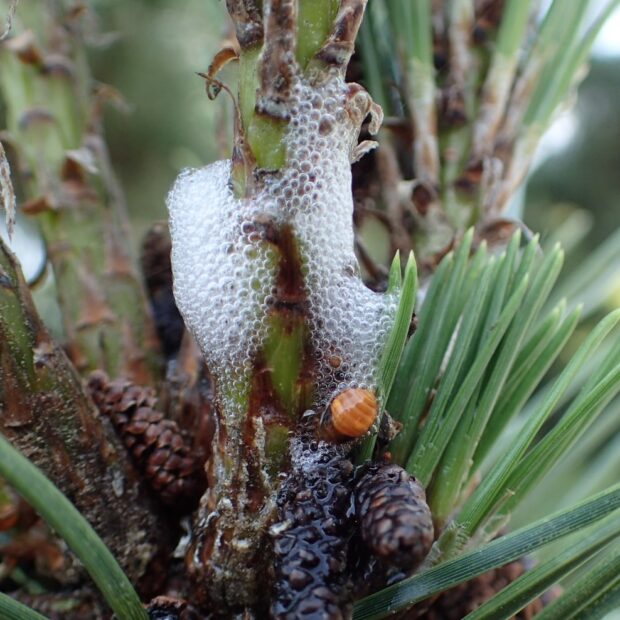 マツに集まるアワフキムシ。 アワフキムシは、 木や草の汁を吸うカメムシの仲間。 幼虫は排泄物を泡立てて泡の住みかをつくり、 その中に隠れています。 成虫は小さなセミのような姿をしています。 (MT)