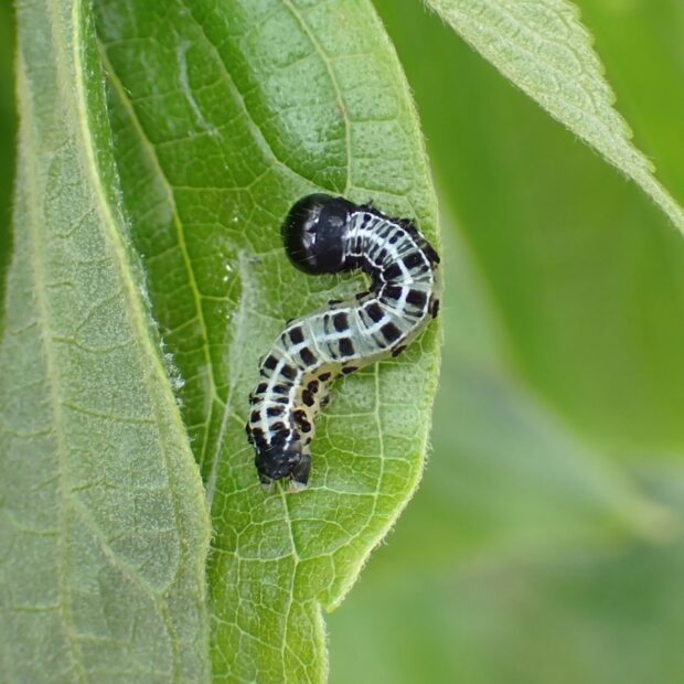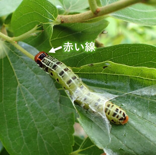 • 終齢幼虫。 頭部は赤く、 頭の後ろに1対の赤い線がある。