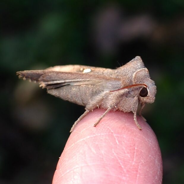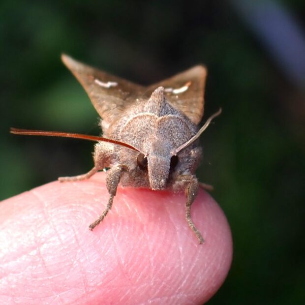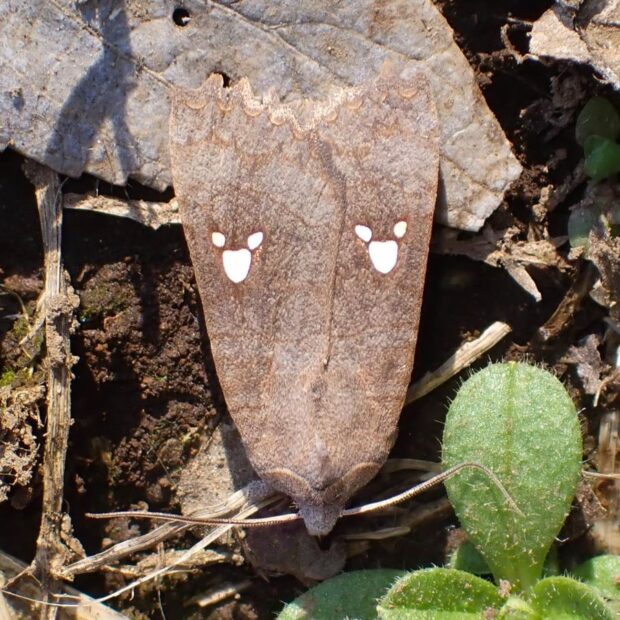 秋に現れ成虫で越冬するキリガの仲間。 3つの紋がミッキーマウスに似ていることから、 「ミッキー」の愛称で親しまれています。 幼虫はエノキの葉をギョウザのように折りたたんだ中に隠れています。