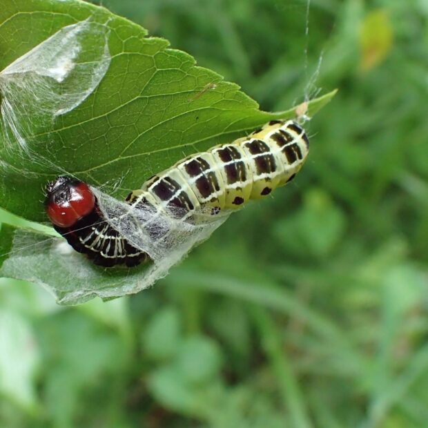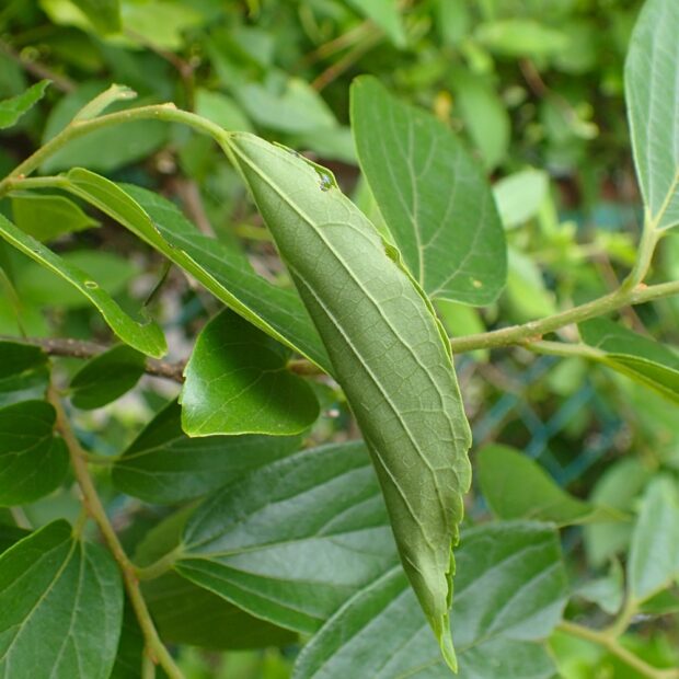 • 幼虫の住みか。 エノキの葉を二つ折りにして、 中に隠れている。