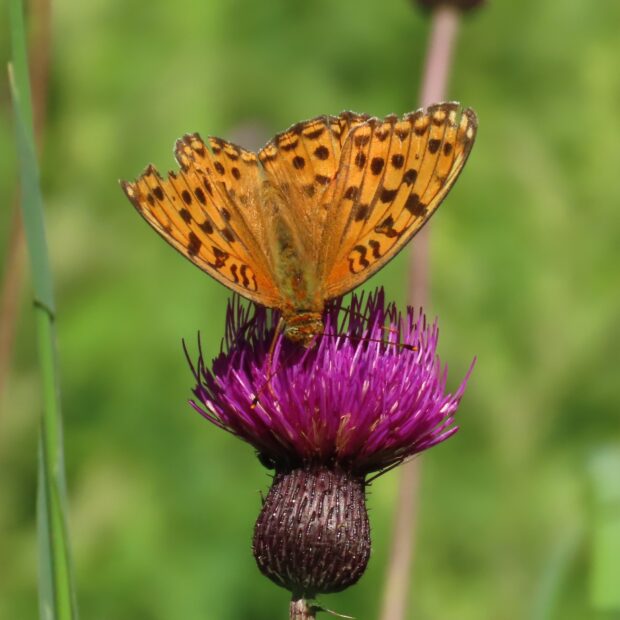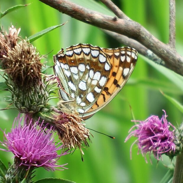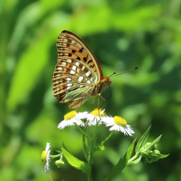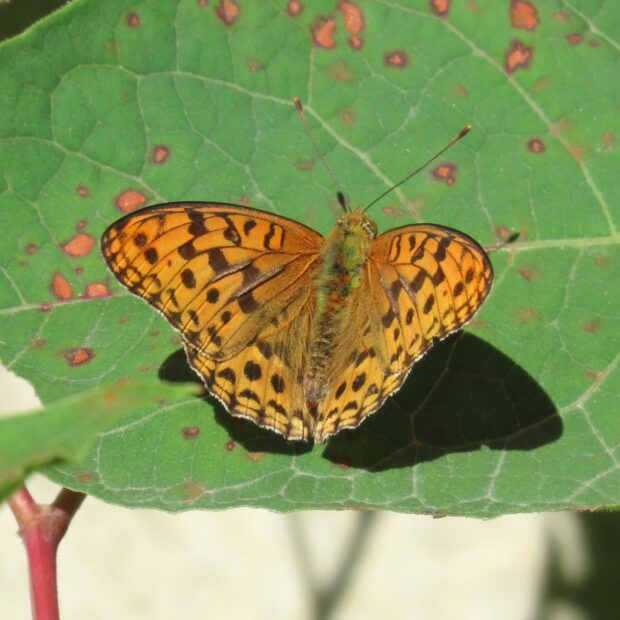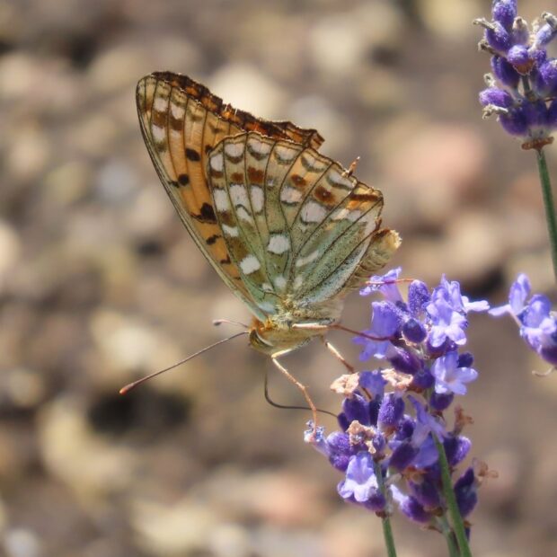 ヒョウモンチョウの仲間。 6月頃現れますが、 盛夏は夏眠し、 秋に再び活動します。 サトウラギンヒョウモン、 ヤマウラギンヒョウモン、 ヒメウラギンヒョウモンの3種に分けられたとのことです。