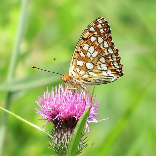 山の草原を花から花へ!ヒョウ柄のチョウ
