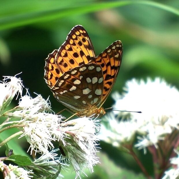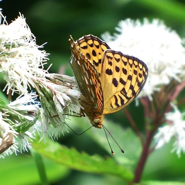 本州の中部以北の山地、 北海道では低地で見られるヒョウモンチョウの仲間。 草原のアザミの花などに蜜を吸いによくやって来ます。 (MT)