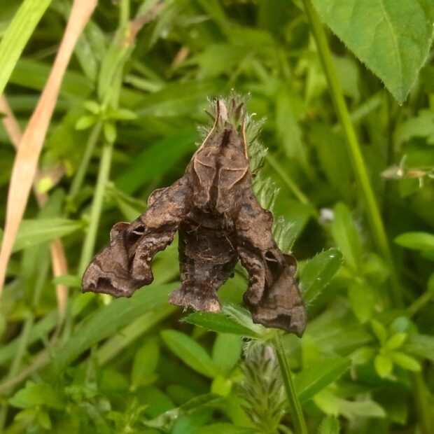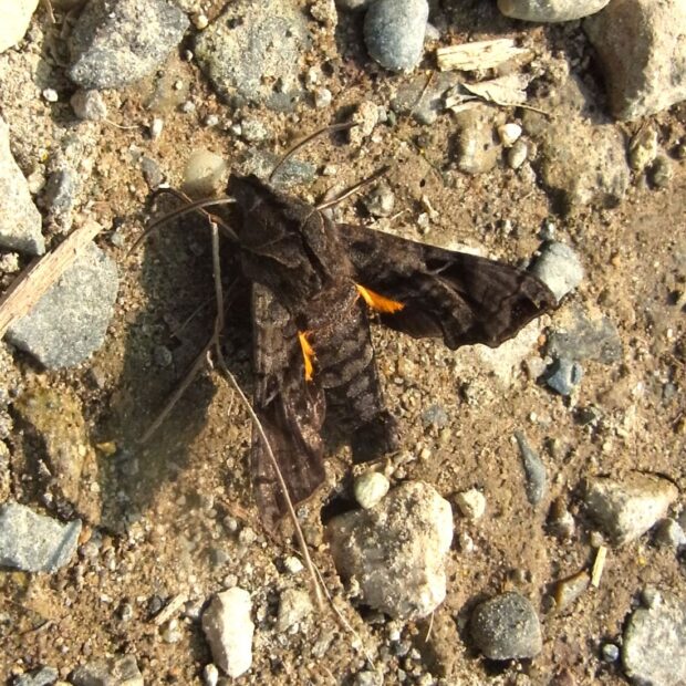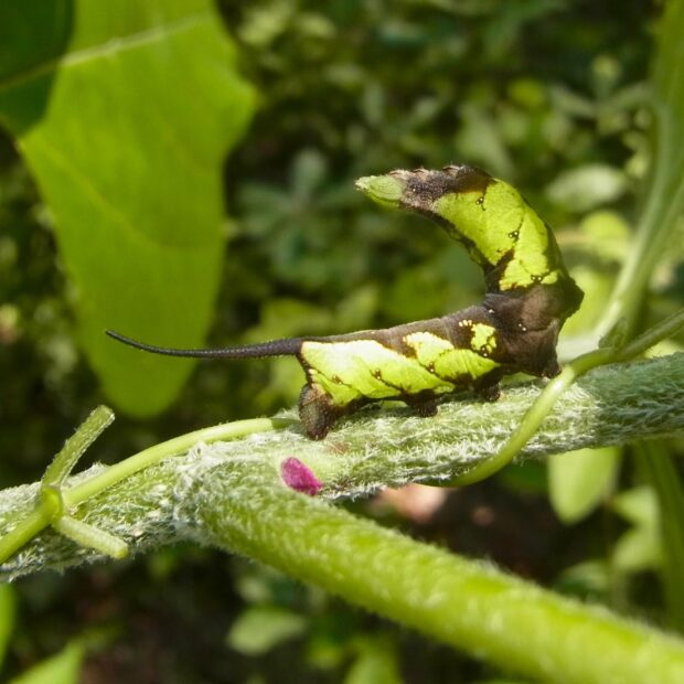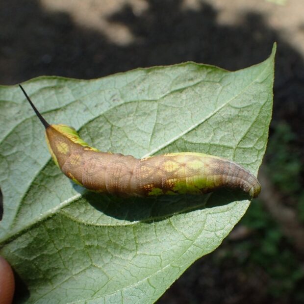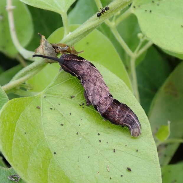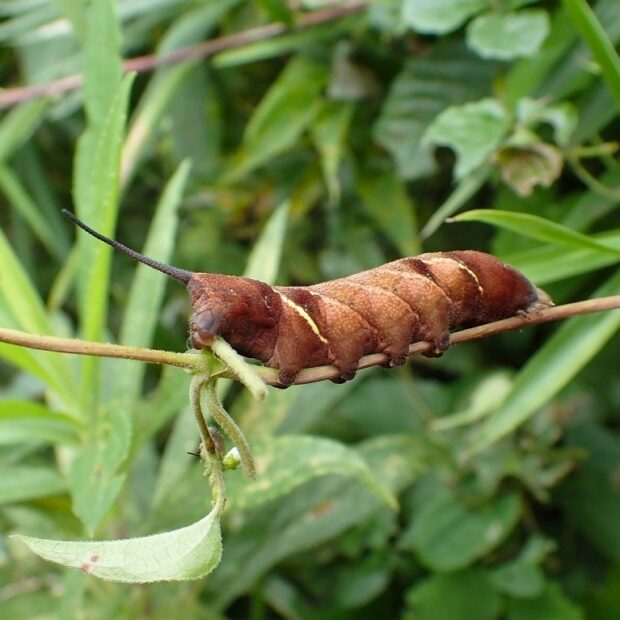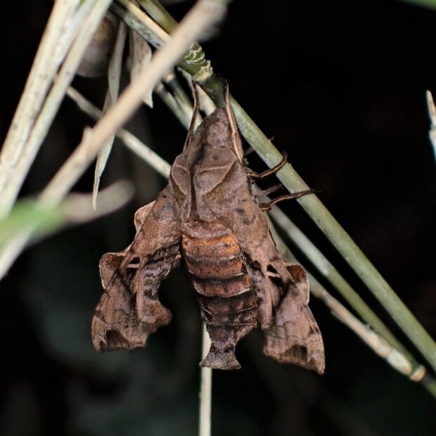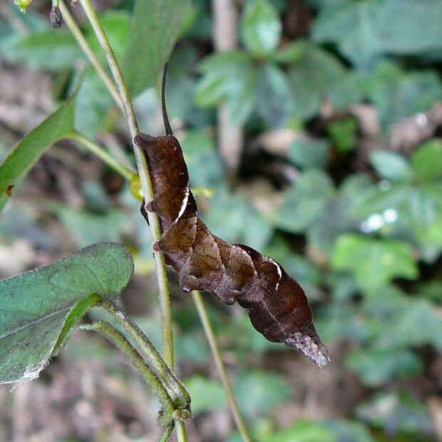スズメガの仲間。 後ばねのこぶ状の前縁が、 前ばねの前縁から突出しているため、 ぶら下がってとまると、 はねがシワっぽく見えます。 飛ぶと後ばねの黄色い紋が目立ちます。 幼虫の体色と模様はさまざまで、 ピンと伸びた尾角はとても長いです。