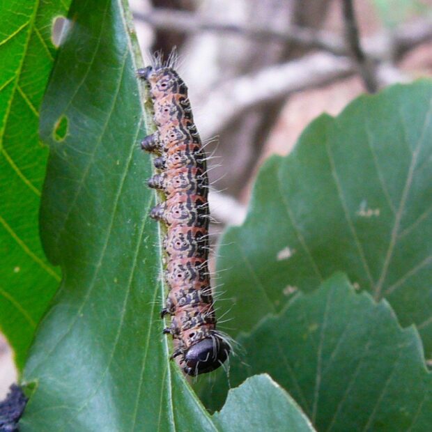 • 終齢幼虫。 赤褐色で黒色の紋が複雑に入る(約5cm)。