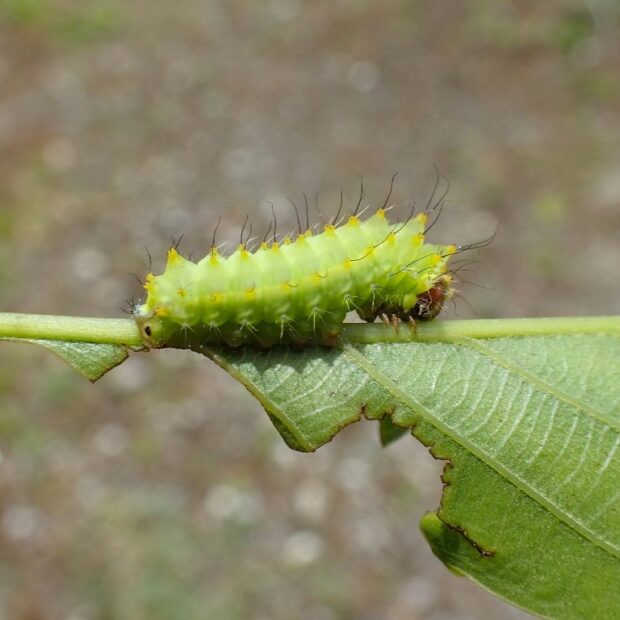 • 幼虫は黄緑色で節ごとに毛の束がある。