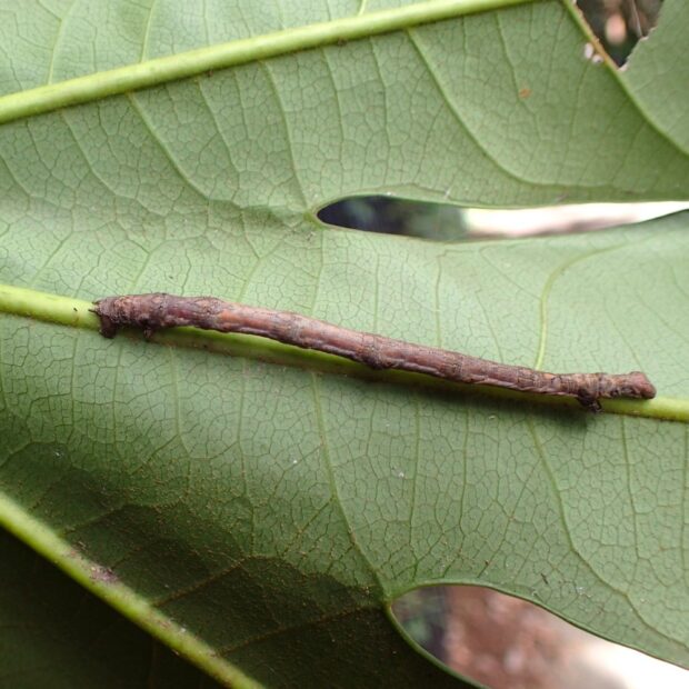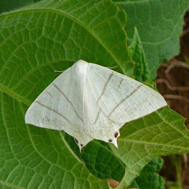 エダシャクの仲間。 白いはねに帯があり、 全体にさざ波が入っています。 尾状突起はとがり、 赤っぽい紋が2個ずつあります。 似ているツバメエダシャクの仲間は数種類いますが、 本種は最も普通に見られます。