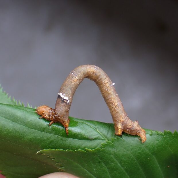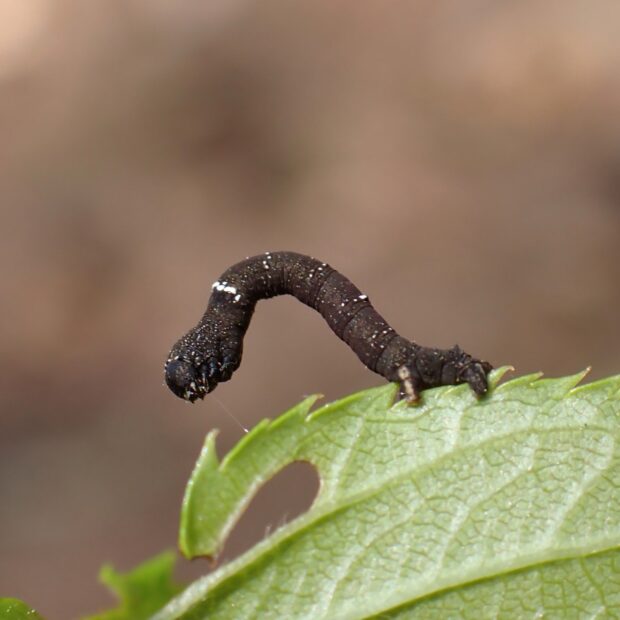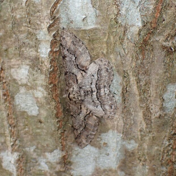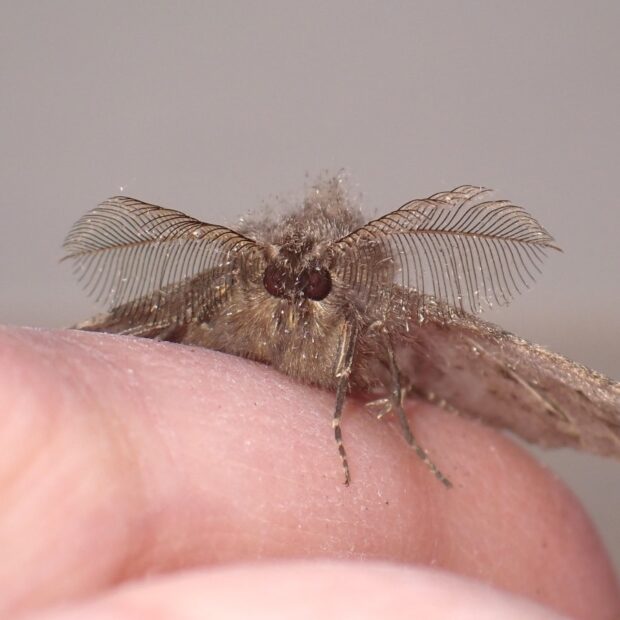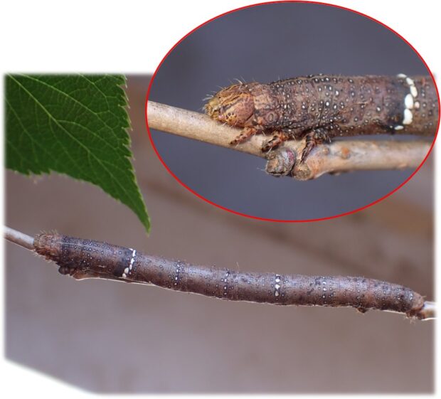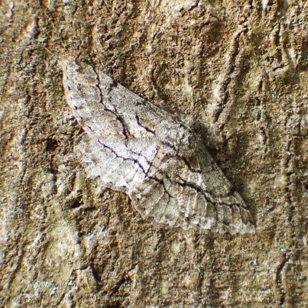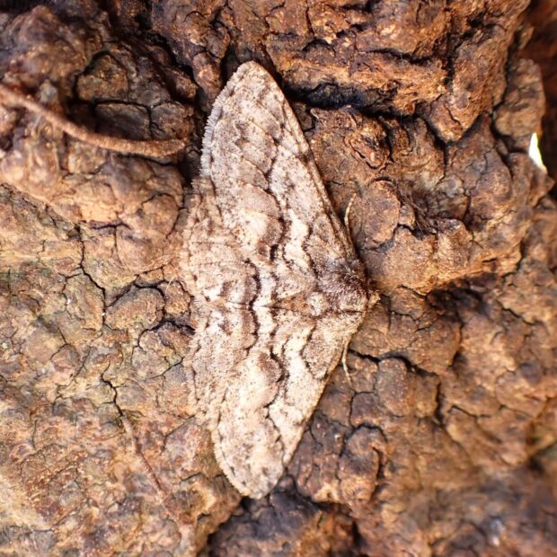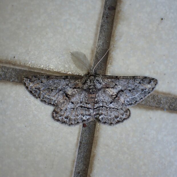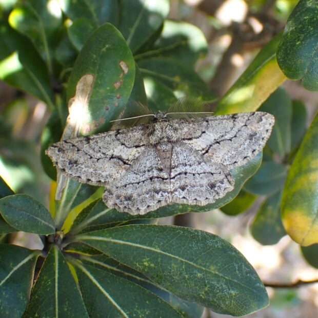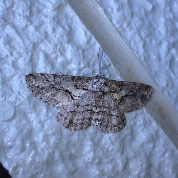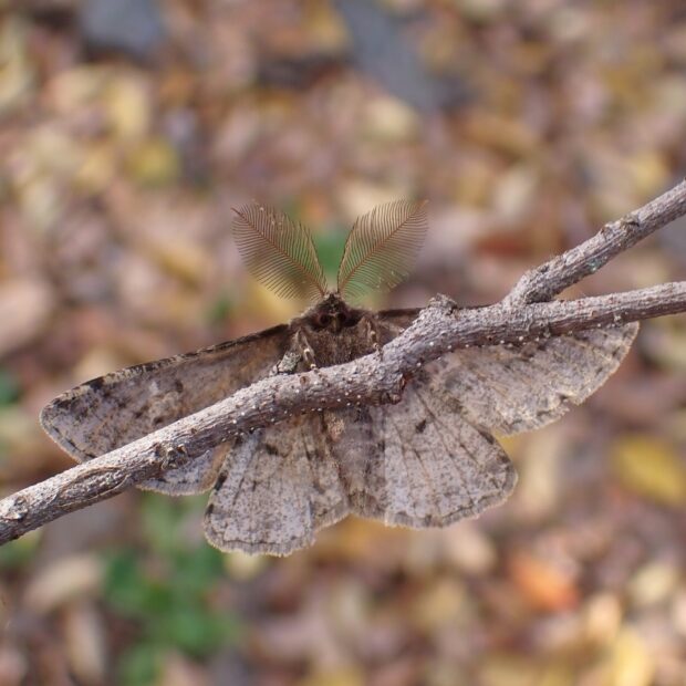 晩秋に現れるエダシャクの仲間。 茶褐色やグレーのはねに黒い帯がありますが、 色や模様には変異があります。 オスの触角は立派な羽毛状で、 メスは糸状です。