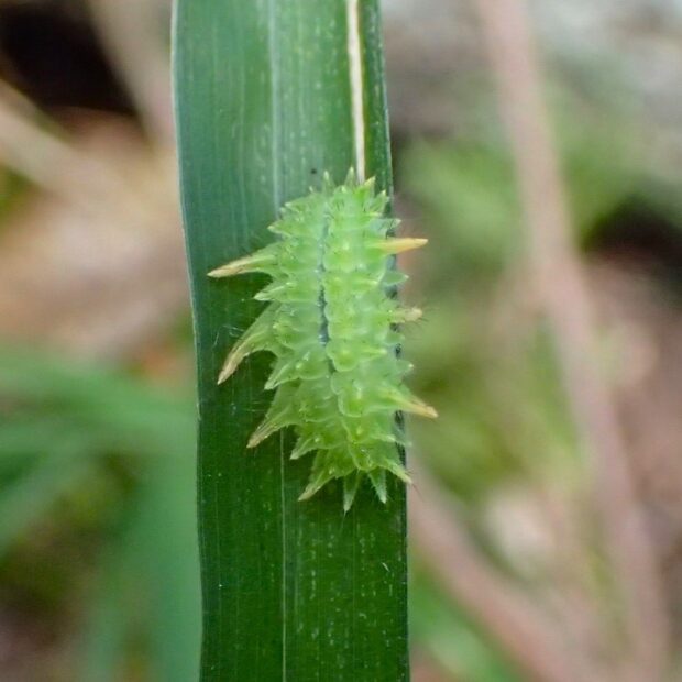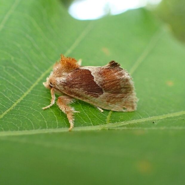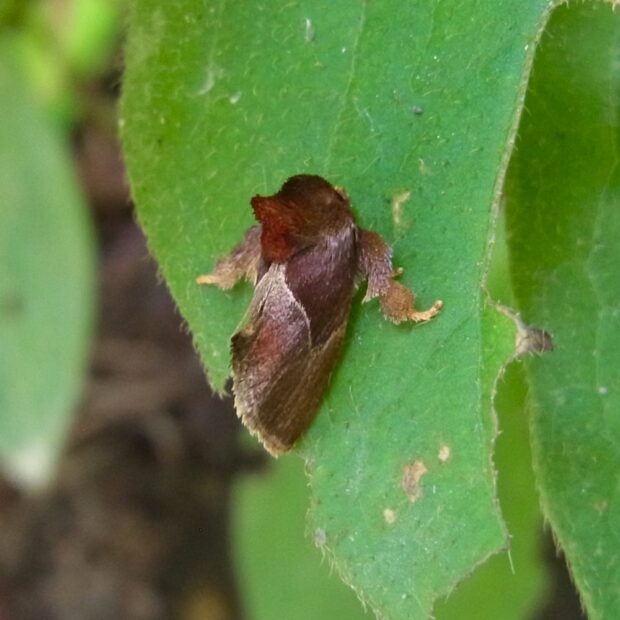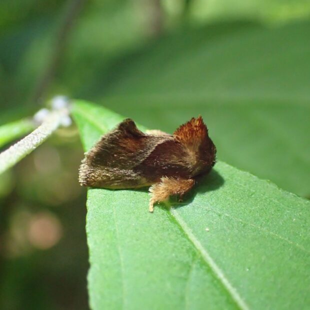 茶褐色で小さいイラガの仲間。 夜行性で、 昼間は葉の上などでじっとしています。 幼虫は淡い緑色で、 多数の突起を持ちます。 そのうち3対の突起が大きく、 先端が赤いです。 雑木林の他、 庭木や公園などでも見られます。
