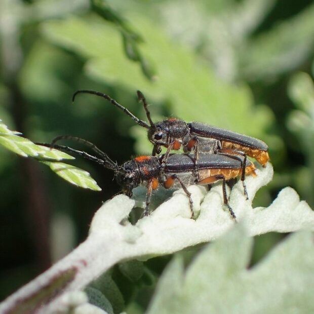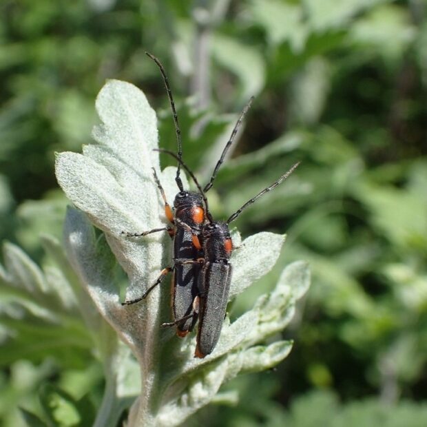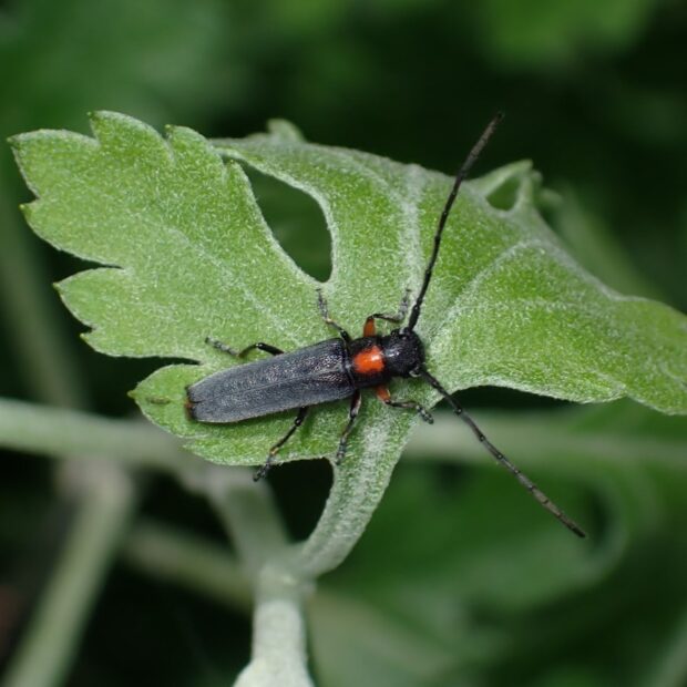 キク科植物で見られる、 体が黒く、 前胸に赤い紋がある小さなカミキリムシ。 メスは産卵のために、 茎の先端2か所の周囲をぐるりとかじるため、 先端部に水分が届かなくなり、 しおれてしまいます。 幼虫は夏に根に入り蛹になり羽化して成虫になります。 成虫は根の中で越冬し、 翌春に現れます。